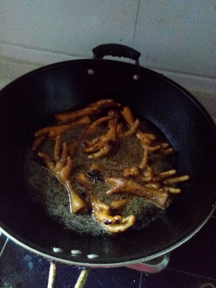 等鸡爪子都凉了,我就开始准备炒一下它们。这个时候用炒菜锅,大火烧热,放进去油,等油也热了,加入蒜和姜,爆炒一小会,放入鸡爪子,这个时候锅里特别热闹,也要做饭的人特别小心,我炒了几下,就赶紧倒入生抽和老抽,又放进去点白糖上色,来回翻炒了几下,倒进去一碗水,盖上锅盖大火收汁了。 看着差不多时间的时候,把火关掉,盛出来放在玻璃碗里,让孩子尝尝,我家的孩子吃的特别认真,这就是做法的动力。 本作品未经作者许可不得转载,转载请征求作者意见。擅自转载使用,将保留追究其法律责任的权利! 个性签名