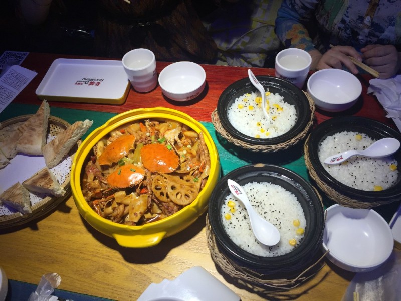 这是我们常去的一家店,是专门吃肉蟹煲的,因为我一直爱吃辣的,所以每回去都要重辣的那个锅,今天我们是四个人只要一个锅就OK了,四个人吃起来外加米饭和水真的是太饱了啊。只不过以往都是吃完饭结帐的,这次却要打单后先付款,服务员说改了规程,也只能入乡随俗了。