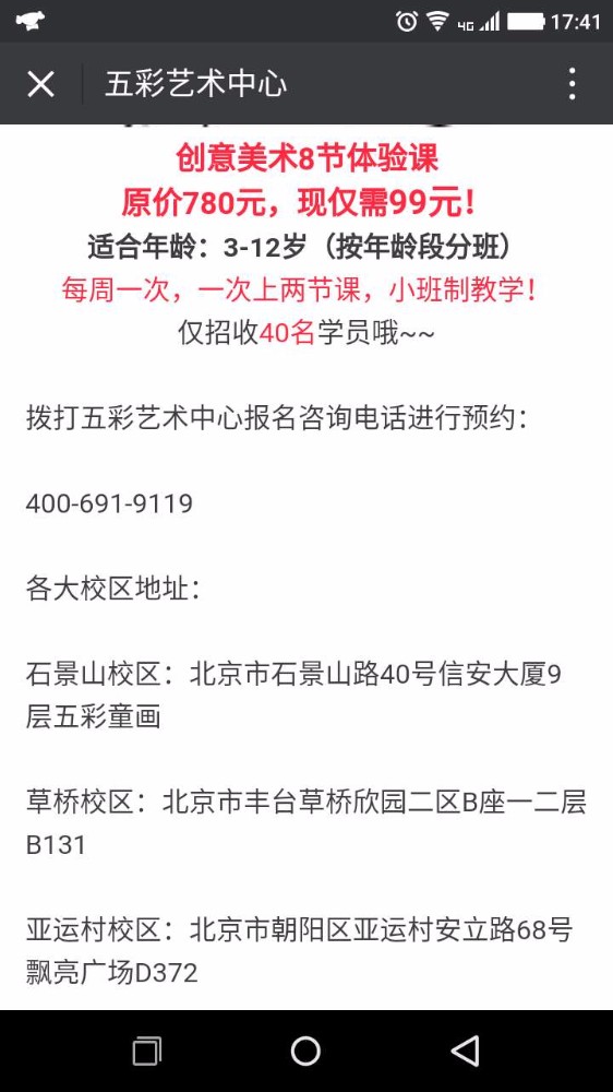 对了,老师今天还给我发了个活动,大家可以来参加一下,只是针对新会员的,我们老会员参加不了,我家宝贝是在五彩艺术中心学的,他们现在搞一个活动,99块钱8节美术课,真的特别划得来,大家可以去看看,一会我把这个截图发给他们的老师,还会有小礼品送的,嘿嘿。