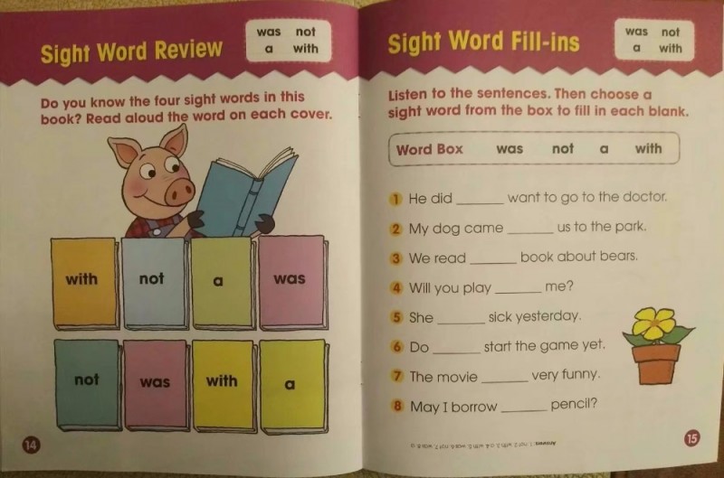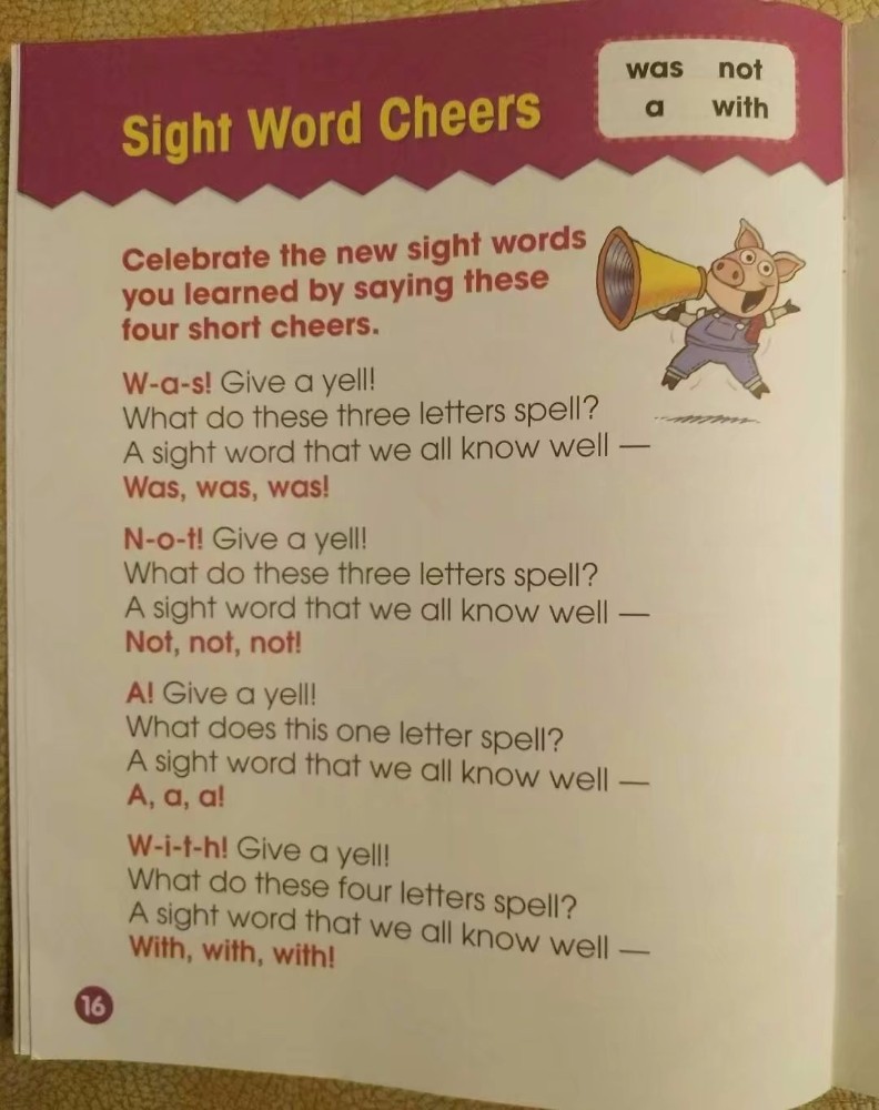 我们收到的这本是《A Book With a Pig》,练习的四个sight words是was, not ,a, with.一个过去式的谓语be动词,一个否定词,一个量词,一个介词,这四个完全不在一个世界的常用词,是如何反复出现在绘本故事中的呢?