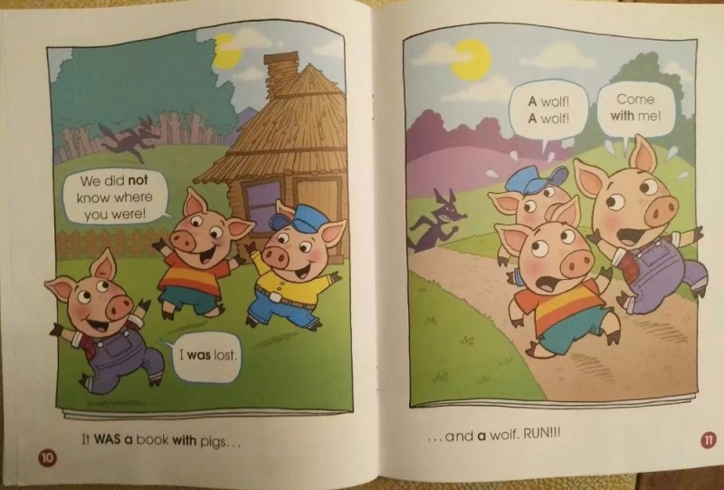 书中的英语句子都非常简单,每一页的主句都是“It was not a .......with ......"的句式。四个sight words (was, not, a ,with)也反复出现在小猪和每一个童话人物的互动中。
