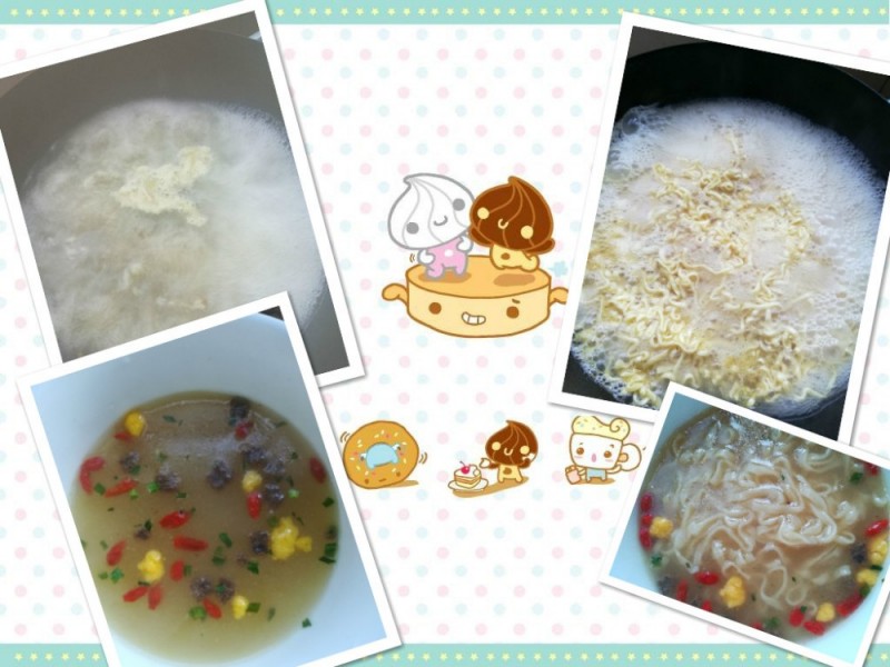 想到超市导购说这个面也很适合孩子吃,于是决定也给大妮来一碗吧!看到调料包之后我就明白了,为什么这个面适合孩子吃。首先面的汤头是高汤,味道一级棒。就像日本拉面的汤头用的都是骨汤的高汤,这样一想是不是就能体会到这个金汤面的味道有多鲜了?而且高汤还是补钙佳品,小孩子在长身体的时候,最适合喝一些骨头汤补钙,而高汤的营养价值远远高于一般的骨汤,“佩服”这个面,把泡面当营养品做了吧! 看看煮好的面,汤的颜色看着就很浓郁,并且不油,适合小朋友喝。还有枸杞子和鸡蛋粒,降火养胃,营养功效都丰富不少。