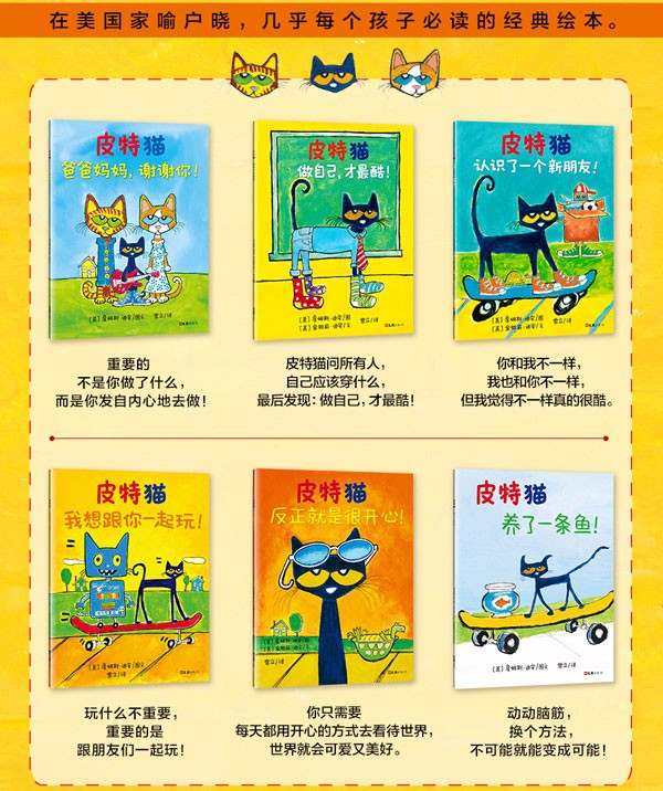 皮特意识到: 玩什么不重要,重要的是跟朋友们一起玩! 5.《皮特猫:反正就是很开心!》 你只需要每天都用开心的方式去看待世界,世界就会可爱又美好。 6.《皮特猫养了一条鱼!》 动动脑筋,换个方法,不可能就能变成可能!