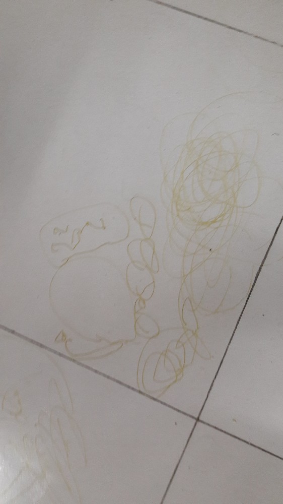 最近他可能比较喜欢画画吧,所以自己也会在地上乱画乱画的,刚开始的时候,也不知所以,不知道他到底画的是个什么东西来的,可是后面呢,慢慢地,就会由乱涂乱画,变成画一个一个的圆圈出来了,有时候又会画一些长长的线条出来,我觉得他特别喜欢画圆圈的。反正画什么东西也好,都会搞一个圆圈出来。