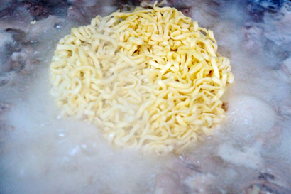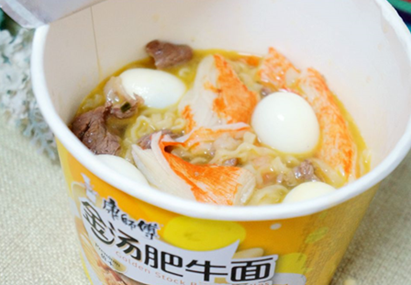 沸水中煮三分钟就可以了。值得一提的是,这个面是宽面条,煮熟之后又香又劲道,就像家里平时吃的手擀面一样。煮熟出锅,小家伙非要我再装回面桶里,怎么说都不用碗吃,问了半天才知道,原来他是觉得面桶很好看,果然是小孩子才能说出来的理由啊。