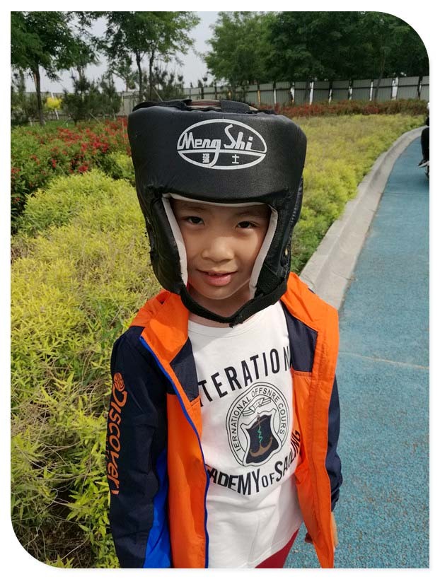 某日,小家伙在爸爸的办公室又发现了一个宝贝,原来是爸爸的头盔,用来进行拳击对打的时候保护头部的,宝贝练习跆拳道实战的时候也有一个呢,无论是从样子还是颜色都感觉比小家伙发现的这个要好很多,可是臭小子又对爸爸这个头套很上心思,而且和老爸商量着送给他呢。其实这个头盔由于时间长已经破损了,孩子喜欢的兴致丝毫不减。最后宝爸的这个头盔也变成了小家伙的专属了。要说宝爸的这些装备真是一点没浪费啊,自己用完,孩子用,使用价值是真高。