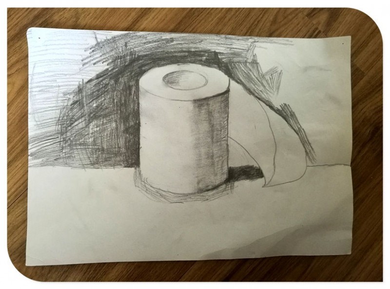 小家伙六月份一共完成了两幅素描画,这是第一幅的完成品。主角是卫生纸,我们生活必不可少的用品。这种物品对于孩子来讲是很熟悉的。看看小家伙完成的画面算是半成品了,卫生纸的造型已经搞定,但是线条处理没有画完就下课了,老师让孩子回家后继续完成。看看咱家小家伙这个背景线条简直是有点惨不忍睹的,线条不均匀不说,而且看起来乱糟糟的,需要好好处理一下。