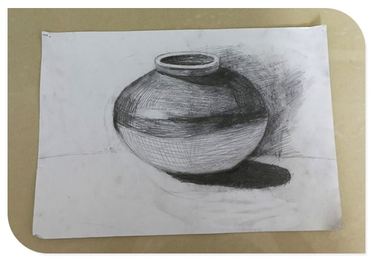 这是小家伙第二幅素描作品,画面主角是陶罐,这个对于孩子来讲是不常见的,不过上课的时候,老师将实物摆在前面供孩子们参考。这个罐子看起来有些复杂,因为无论是罐子的瓶口还是罐身突出的造型都需要十足的立体感才能呈现出来。小家伙在罐子的构图方面完成的还算是不错的,这一个罐子也是需要两堂课才能画完。