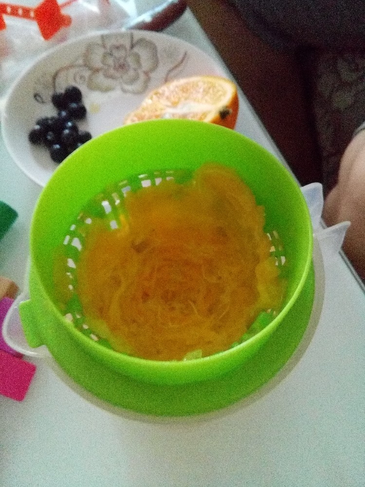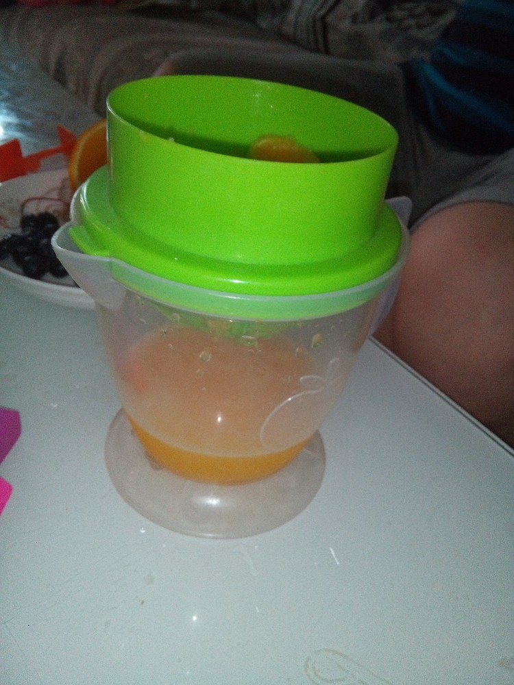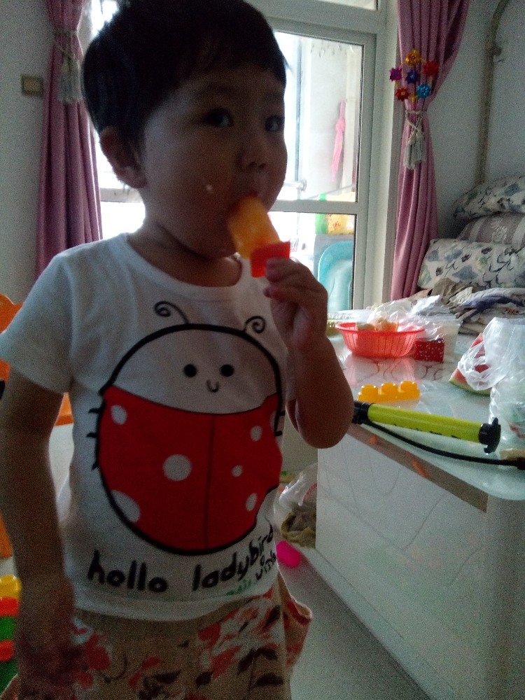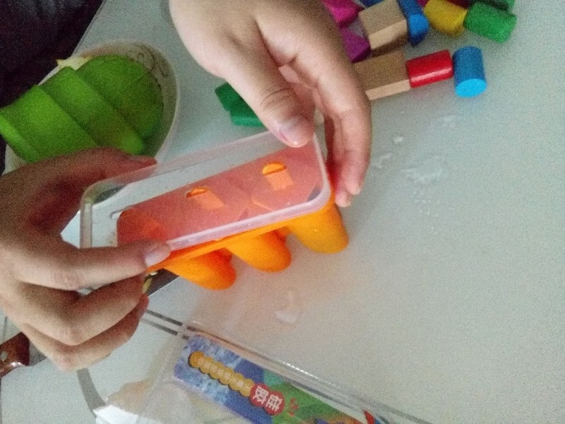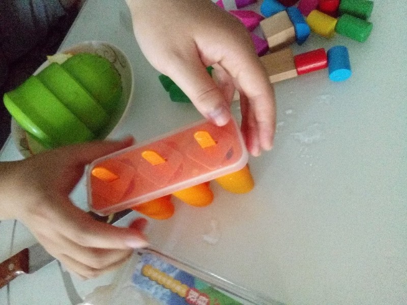 买回来以后就着急着动手了,我帮助他洗了洗模具,然后老公把橙子切了三个,我又拿出来一把蓝莓,还有其他的水果,但是第一次做就没有用太多,老公说先尝试一下,用榨汁机把橙子的汁挤出来以后,倒满了两个模具,然后挤压蓝莓的时候发现这个水果不出水,就让我加了点开水直接放进冰箱冷冻起来。晚上的时候就着急拿出来吃呢,那个橙汁吃起来酸酸的,不咋的,蓝莓的更是没有味道。第二天老公又买回来大西瓜,开始弄西瓜汁,弄的比较多,让孩子先喝了点,剩下的都倒进模具里了,放在冰箱里冷冻,晚上睡觉前,老公拿出来了,我们一家人围着这么一个冰棍来回吃,真是可笑,因为西瓜比较甜,味道还可以。