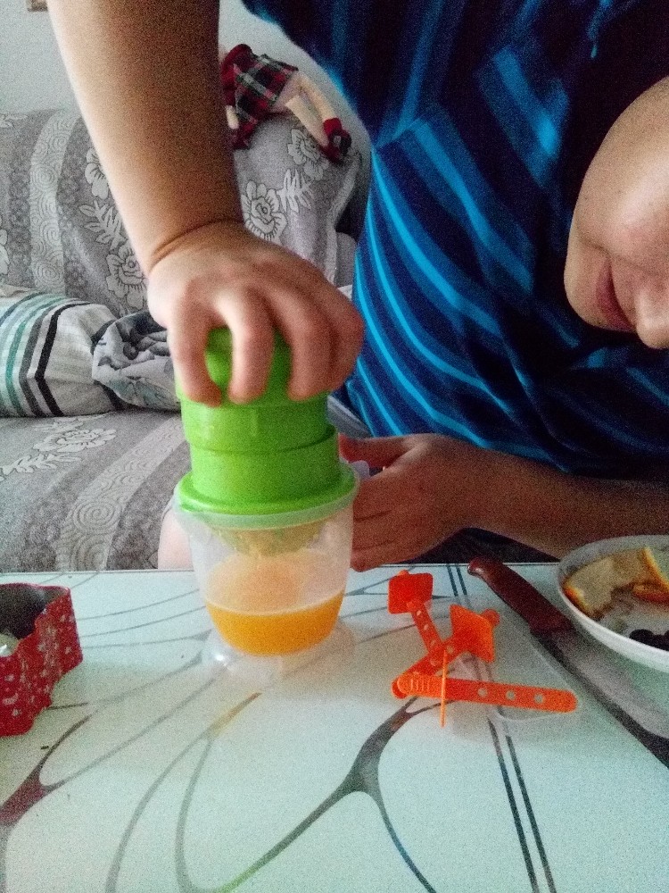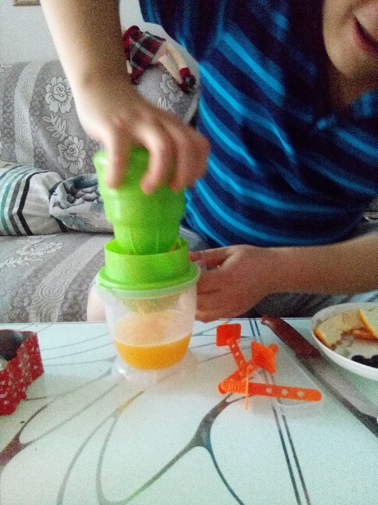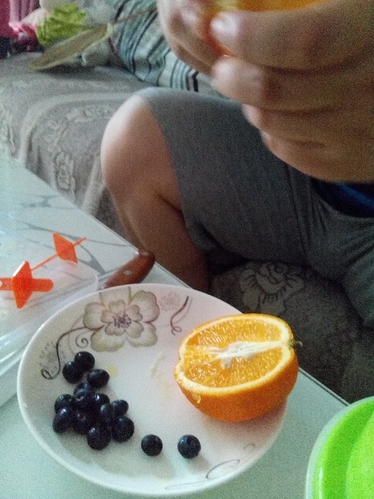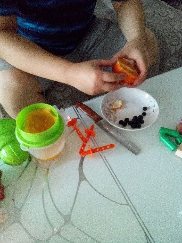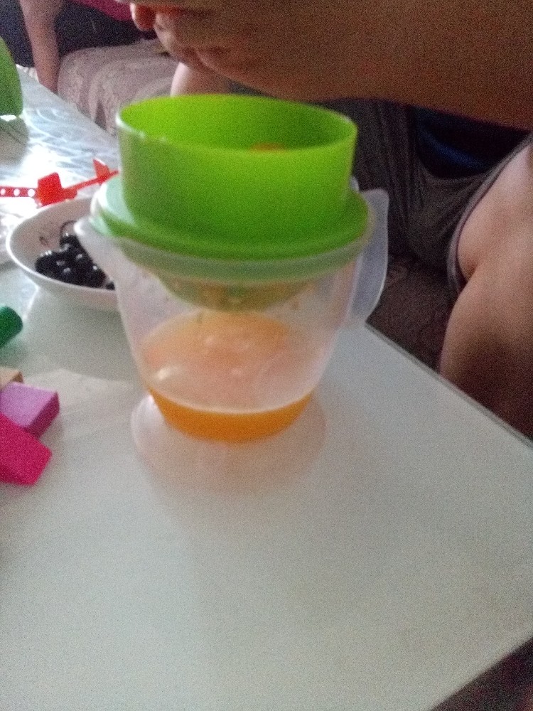 买回来以后就着急着动手了,我帮助他洗了洗模具,然后老公把橙子切了三个,我又拿出来一把蓝莓,还有其他的水果,但是第一次做就没有用太多,老公说先尝试一下,用榨汁机把橙子的汁挤出来以后,倒满了两个模具,然后挤压蓝莓的时候发现这个水果不出水,就让我加了点开水直接放进冰箱冷冻起来。晚上的时候就着急拿出来吃呢,那个橙汁吃起来酸酸的,不咋的,蓝莓的更是没有味道。第二天老公又买回来大西瓜,开始弄西瓜汁,弄的比较多,让孩子先喝了点,剩下的都倒进模具里了,放在冰箱里冷冻,晚上睡觉前,老公拿出来了,我们一家人围着这么一个冰棍来回吃,真是可笑,因为西瓜比较甜,味道还可以。