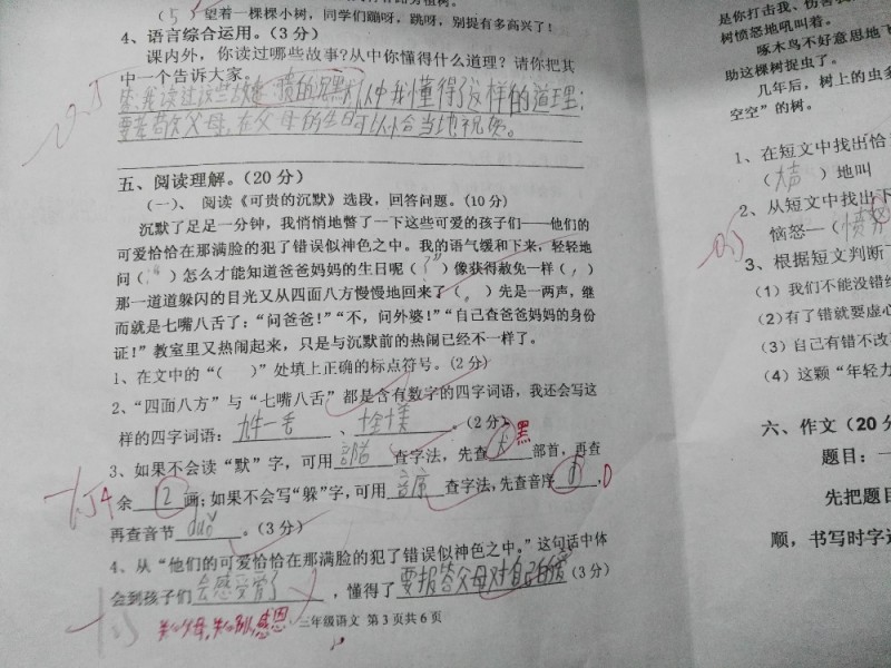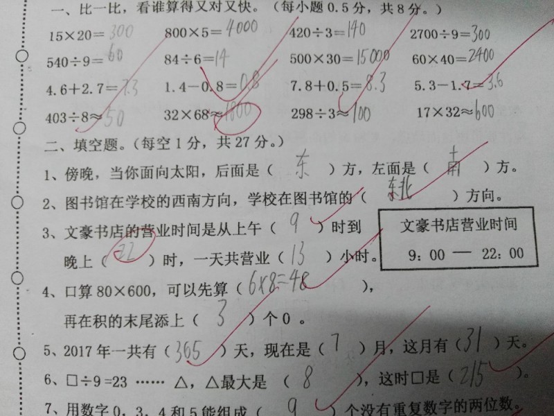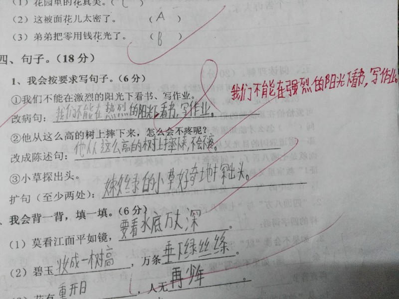 下午熙熙放学后,我第一时间就想看看他的试卷了。我先看了熙熙的英语卷子,发现他错的地方都是很粗心的。有一道题,问的是午餐和饺子的,他也知道饺子的英文单词,可偏偏却做错了。三个选项中,只有一个说到饺子,怎么可能会错的呢?还有一题是需要找否定答案的,也是只有一个答案是对的,他却选择了肯定的回答。 熙熙的英语一共错了四个地方,连词成句的,题目明明是要用问号的,熙熙又用了句号。最后一个就是位置写反了,这些都是书本有的。熙熙做错了也是和粗心有关,今年英语不难,很多人的成绩都不错。老师公布了班里英语期末考试情况: 老师说试题都是基础类,比较简单,因此这次考试的整体成绩较好;合格率94.1%,优秀率78.4%(88分以上为优秀,包括88分),100分2人,90分段36人,80分段6人,70分段2人,60分段2人,不合格3人,班平均分90.1分。 ![]() ![]() 熙熙的数学是三科中成绩最好的,也是因为粗心拿不了100分。我发现熙熙的每次考试,错的都是容易的题目,难的反而做对了。有一道是估算题,32*68熙熙算出来的是1800,他用了30*60,应该是30*70才对。还有一题是关于时间的,熙熙每次遇上时间的题目都会错。题目是问营业时间的,熙熙写的是晚上22时,因为有晚上这个词,应该是写晚上10时的。就是这两题扣了1.5分,要不熙熙就是100分了。 ![]() 三科中熙熙的语文向来是最差的,这次语文老师对期末考试试卷分析如下:这张试卷题目比较简单,基本上都是基础知识,需要理解的内容较少,考的其实就是孩子们的细心程度。90分以上:26人,最高分99.5。80-90分:17人,70-80分:4人,60-70分:2人,不及格:2人,平均分是85.6分。熙熙的成绩是89分,等于在班里已经排到30名左右了。 这次熙熙的语文还漏做了一道题,可见他是多么的粗心。还有照抄的字也可以写错,这样的问题已经发生不知道多少次了。平时熙熙最怕的就是写作文,他刚考试回来,我都以为作文肯定扣分很多了。我看了一下熙熙的作文,用词倒是不错的。就是有一个地方少写了一个字,导致整句话的意思都变了。还有一个关于改病句的,原文是:我们不能在激烈的阳光下看书、写作业,熙熙把激烈改为热烈。我没想到熙熙竟然不会这个,强烈的阳光应该很熟才对。看来以后,也要加强这方面的学习了。现在考试已经结束了,成绩多少已成定局,也就不去多想了。 ![]() ![]() ![]()