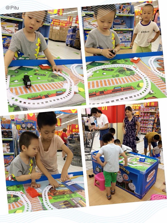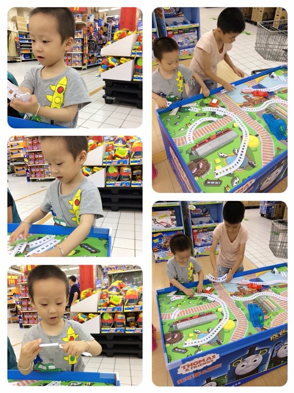 今天晚饭后我们也出来逛超市啦,自然超市里也依旧是非常的热闹。小朋友很多,有的在看书,有的在玩玩具。大超市里一般都会有一些玩具的展示和试玩,所以特别的吸引孩子们。今天有一款托马斯的轨道车的拼装,宝贝一下子就被吸引过去了。宝贝也加入进去和一个小哥哥一起玩了起来。一开始各玩各的,不过一会儿后完成了一片,小孩子嘛都是自来熟,一下子就能玩到一起。一些轨道,还有一些道具,可以拼搭出漂亮的场景。小男孩本身就特别的喜欢车车之类的玩具。平时家里托马斯小火车的玩具也有,不过像这样比较大的轨道和漂亮的道具组合的还是第一次玩。一看到新玩具就有新鲜感,当然这样试玩的机会怎么能错过的。宝贝开心的拿着一块块轨道,开始在展示台上拼起来。