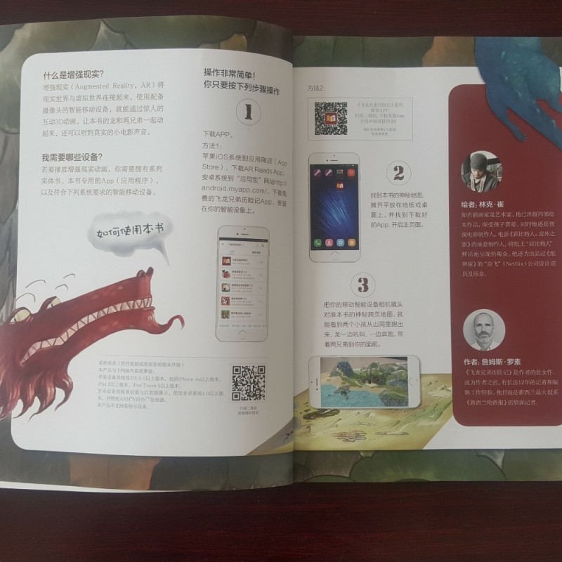 这是来自中国青年出版社联手宝宝地带送出的图书大礼包,地带里302位朋友申请,中奖名额18个,本来想把这次机会让给年纪更小的读者的,一想最近也地带里也没有中意的书籍,就权当给孩子申请一份精神食粮吧,免得整天手机不离手,满脑子都是王者荣耀游戏。以前没有申请过新西兰的书籍,只知道新西兰是个地广人稀的国家,牛奶也出口到中国啦,这套《飞龙兄弟历险记》是作者詹姆斯·罗素的处女作,处女作一般都是呕心沥血后的佳作,因为万事开头难,第一炮能够走红书市,靠的就是无与伦比的付出。冒险小说市面上太多了,小读者也希望看到耳目一新的作品,如果都是怪兽想毁灭地球和一群少年侠士胸怀拯救地球家园的重任,途中历尽千辛万苦,发现了藏宝图,然后根据图纸寻觅到打败怪兽的制胜武器和秘籍,这是我作为家长的观点,但是孩子不这样认为,只要是探险书,她还是比较认可的,本书讲述的是一个颇具想象力的冒险故事:弗里恩和帕迪两兄弟,爱犬可可被飞龙掳走,痛失心爱的宠物,当然不会善罢甘休,两兄弟决定找回爱犬,真是功夫不负有心人,找到了失而复得的可可,顺便还带回来新的宠物,是飞龙埃尔顿,飞龙随着时间的推移,慢慢的成长,还引领两位兄弟和可可回到它曾经的家园开party。这套书的印刷质量简直是太优秀了,采用了当今最流行的AR互动技术,起初我也弄不明白何谓AR,上网百度才似懂非懂了,反正孩子喜欢,对于出版社就增加了很多难度,想让一套书从众多少儿出版物里脱颖而出,需要下足苦功是当然的了。少儿书籍文字不需要太多,但是插图必不可少的,这套书的插画很到位,是一位颇有名气的电影制作人。曾担任《霍比特人》场景制作人,怪我孤陋寡闻,霍比特人我也没有看过啊。