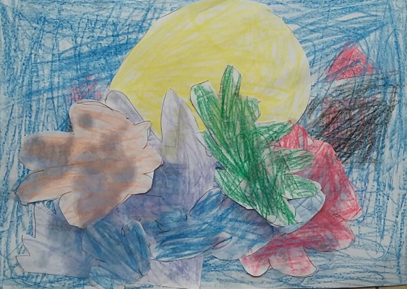 这幅画也是拼贴而成的,本来人家弄的是一座城堡,可由于小家伙跟不上,所以他就按照自己的想法来弄了,然后就弄成下面这个样子了,看上去像是一个月亮和几棵树的样子。