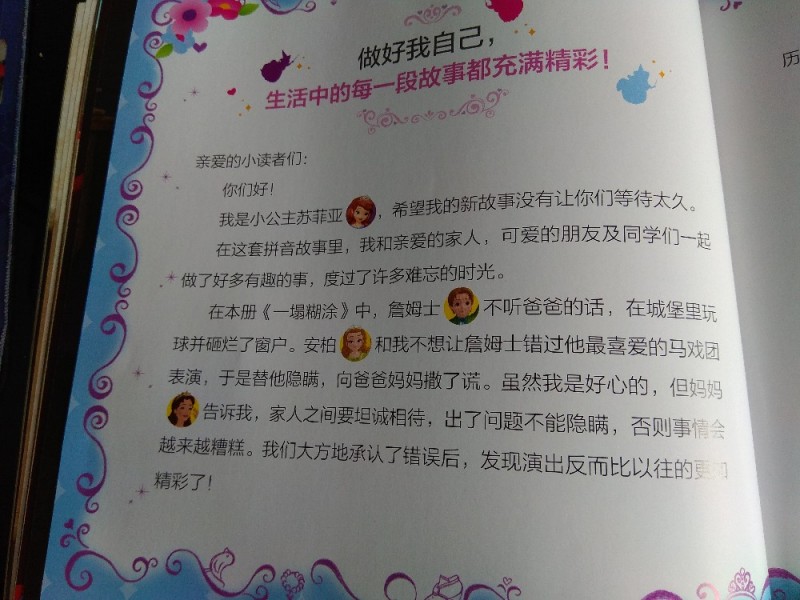这次童趣出版有限公司编《做好我自己》系列是启迪孩子心灵的拼音故事,也是小公主苏菲亚和她的生活中的一些小事的故事。我们有时候会遇到一些糟糕的事情,小公主苏菲亚也不例外,并因为她是公主就没有烦心事,《一塌糊涂》这一册就是讲到小公主和她的兄弟姐妹们出现了特殊情况怎么办的内容,给孩子们讲述了坦诚是一种很棒的人性。
