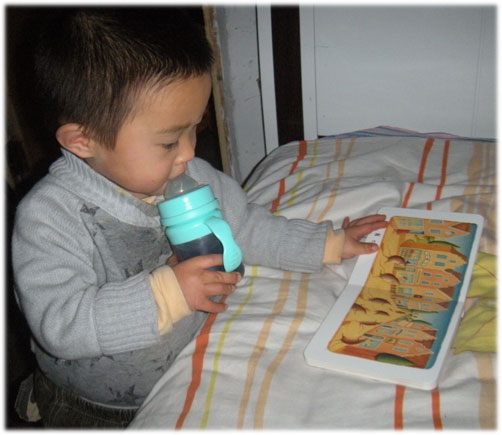在线跟读的时候,思路都是跟着大家一起走的,可当自己把这本书拿到手里,却突然想不起当时管管是如何给我们介绍这本书中内容的,我也突然不知该如此引导孩子去看这本书了……郁闷了一阵,想放手让他自己去看好了,都说孩子的想象力很丰富,看他能不能瞧出什么新鲜名堂来~ 小家伙把书拿在手里,先是漫无目的的乱翻一通,前两遍他都很快变翻完了,看得出,没有用心,而且过程也没有自言自语或找我交流。我以为他对此书没有兴趣,发愁的想着要怎么引导才能找到他的兴趣点~~试了几次都不成功,我一指着某页告诉他是什么,他就不耐烦的翻过篇去…… 后来,我突然想到,小家伙最爱好的事情,好像就是吃了。只要是跟吃沾边的事,他貌似兴趣都挺浓厚的,于是我端详着封面自言自道“哇,好大的一个鸡蛋呀!”(请原谅我把大雁蛋称作是鸡蛋,因为我试着和秃秃说过这个蛋的名字,不管我说什么蛋,他都说不是,就认准了这个叫‘鸡蛋’),秃秃一听说有好吃的,赶紧和我一起盯着蛋看了半天~~ 从这里入手,小家伙还真有些喜欢上这本书了,经常和我说“睿睿想看大鸡蛋”~~唉,这个大雁人物也挺惨的,明明是自己的蛋,却要被孩子说成是鸡蛋,而且秃秃还很有意思的总管大雁叫大鹅!可能脖子都比较长,确实有些想象之处吧…… 有了良好的开始,才会有后面更多的续文,我对宝贝讲这书中的数字和故事时,他一点兴趣也提不起来,可如果我们只单纯的分析哪个事物叫什么名字,他就很有兴趣同我一起去猜了~~主孩子一起猜动物、植物很有意思,我一说那些是大老鼠,秃秃就反驳我说“是小老鼠”,我一说是大雁,他又反驳我说“这是大鹅”,问他那些小人儿扛着铲子要干嘛去,他认真的回答我说“干活去”…… 在这整本书里,让他最喜欢的就是封面那个‘大鸡蛋’了,因为可以‘吃’~~封底有个狼外婆,我只和孩子说过它是大灰狼,装外婆来吓唬小女孩呢,后来秃秃不知怎么想的,一看到狼外婆就指着它大喊“你是坏孩子!”,这个小家伙,是非善恶分辨的还蛮清楚嘛~~我们虽然每天都会拿这本书看几下,可却一直还没切入正题学其中的主旨。不着急,慢慢来,培养好孩子对看书的爱好,才能更轻松的完成后面理解更深入的任务……