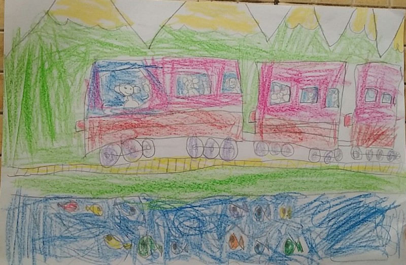 画完画后,小不点又自己翻阅了一会《感谢的味道》这书,当他看到有火车这一页画面时,他竟然说要画火车。好吧,画就画吧,反正他之前也没画过火车。虽然这是小不点第一次临摹书上的画面画画,但我觉得他把画面上的场景都已经画出来了,而且也涂了颜色,所以我觉得还是可以的了。