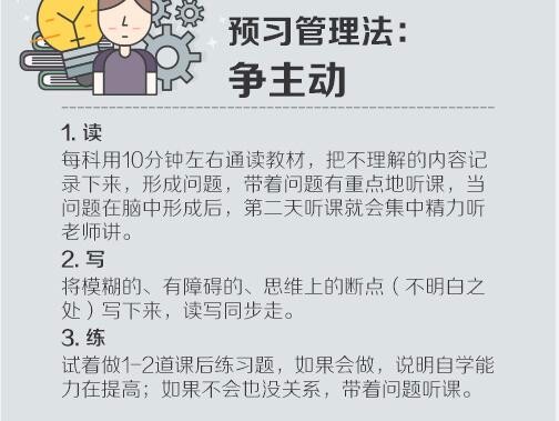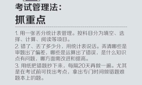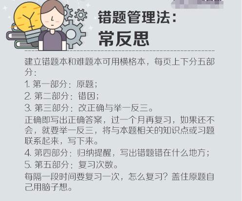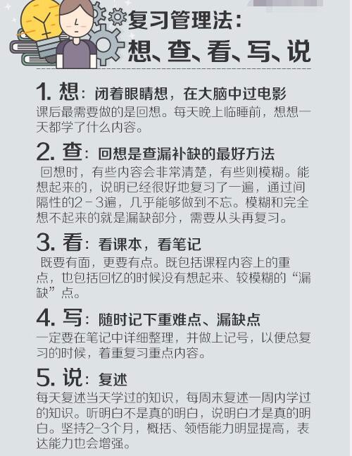 ①想:每天晚上临睡前,回想学过的内容;②查:找出印象模糊和完全想不起来的知识点,着重复习。③看:既要看课本,也要看笔记,点面结合;④写:随时记下重难点,详细整理做好记号;⑤说:复述知识点。听明白不是真的明白,说明白才是真的明白。