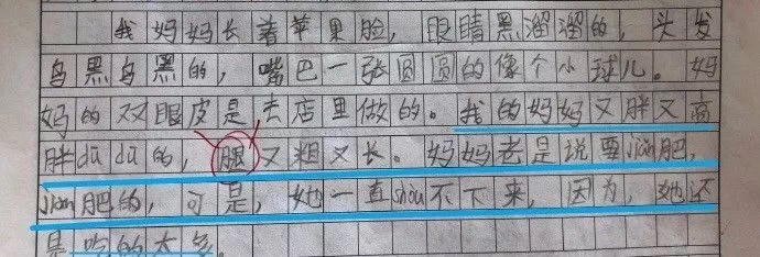 呵呵,这个形容词字写错了,老师没有批出来,希望宝贝下次不会再写错。美人蕉这个形容应该不太贴切,估计孩子只是想形容妈妈比较漂亮,但是又不知道美人蕉是啥东西,听说过就顺便写上了吧。在孩子眼中妈妈应该就是一个大美女。 范例5、我妈妈身材很高挑,因为她为了保持身材,每天的饭菜都吃得很少,而且经常把她的菜夹给我们吃。