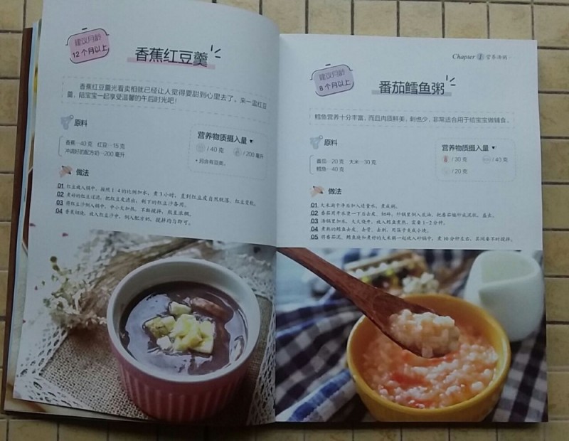 这是香蕉红豆羹和番茄鳕鱼粥的详细做法,操作简单,而且营养丰富。需要注意的是,香蕉红豆羹比较适合一岁以上的宝宝食用,而番茄鳕鱼粥则适合8个月以上的宝宝食用。不瞒大家说,如果没有编者左上角的小标注,估计我也是不清楚多大的宝宝食用的,可见编者是多么的细心和人性化了。