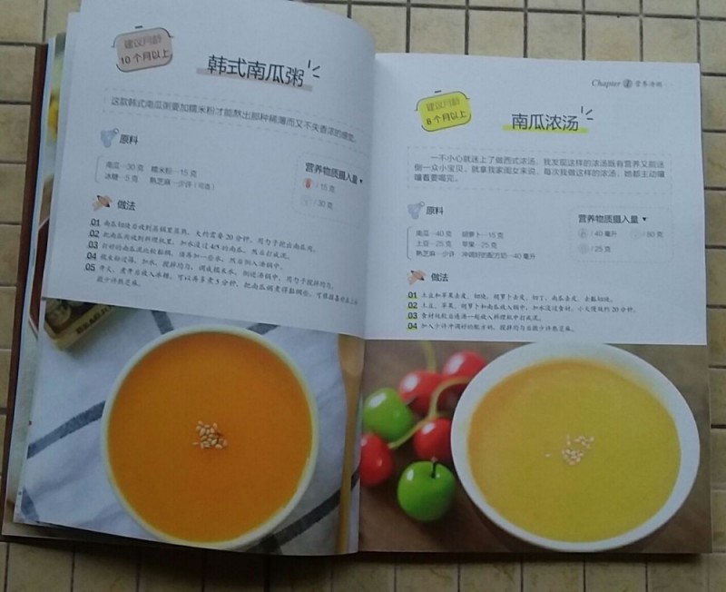 虽然小不点一直都很喜欢吃南瓜,但由于我平时的做法比较单调,而且看上去卖相也不怎么好,所以小家伙吃一两顿后就不想再吃了。不过,幸好这书里面有南瓜的其他做法,比如下面这两道——韩式南瓜粥和南瓜浓汤。话说南瓜的这两种做法我从来都没做过,原来想让南瓜粥更好吃和更好看的小秘诀是加入糯米粉(用水调稀)一起去煮,又或者把炖好的南瓜一起放到料理机里打成泥,这样的话不但孩子喜欢吃,而且颜值也很高。