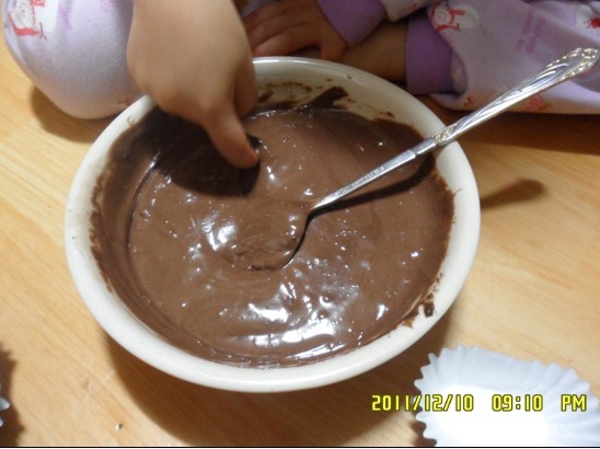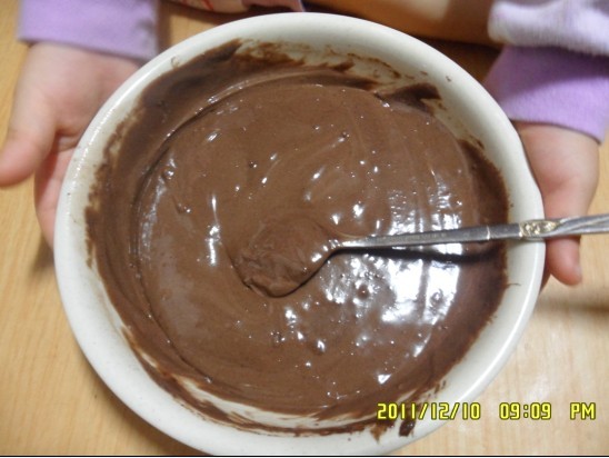 妈妈我前几天上超市,看见有做巧克力糕点的材料,很简单,只要看着说明就能坐下来的,于是就买点回家给孩子们作了,做出来的效果还可以,但是孩子们不怎么喜欢吃做出来后的作品,倒是很喜欢吃做的时候搅拌出来的液体,呵呵不过再怎么说还是要做出来以后才能吃, 生的吃了会闹肚子的。儿子是什么都吃,永远给我的面子,女儿就比较挑剔很难对付的,每个家庭里都会有一名很挑剔的成员把。