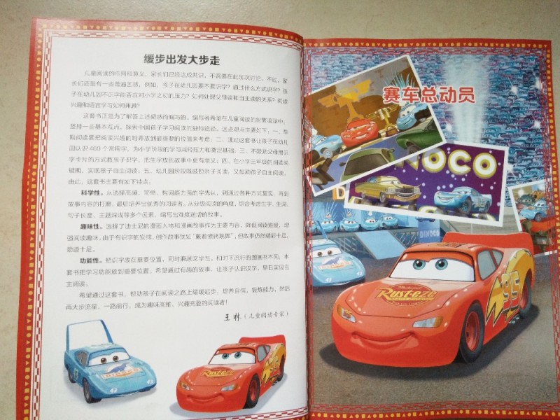 《迪士尼我会自己读》分为中文和英文两种。中英文的分级阅读都在群里分享过多次了。大家都认为这是一套特别棒特别适合孩子的辅助用书。这套书根据孩子的阅读字量范围分为8个级别,其中前6级为学龄前儿童阅读字量,后两级为小学一年级儿童阅读字量。介绍上说第五级共六册,每一册有两个故事。我收到的是《赛车总动员》,里面是有二个故事的。《赛车总动员》的故事大家非常熟悉吧。我也看过这个故事。我觉得迪士尼的故事都非常生动有趣,在故事中蕴藏着大道理。让孩子在非常开心轻松的范围里既学习了汉字知识也懂得了道理。迪士尼故事陪着我们一代又一代人成长。 这套《迪士尼经典电影漫画(典藏版)》的最大魅力就是完整的收录了电影原图,让孩子们在阅读中体验到看电影时的乐趣,并且这些乐趣不再局限于屏幕中我们随时随地都能看到精彩的故事内容。在欣赏完精彩的故事后,书的后面还有很多形式多样的游戏测试页。孩子可以通过连线、词语接龙等形式熟悉书中学到的汉字。后面还有一个生字表。对书中的生字进行了汇总。这些字放在一起也便于孩子学习和掌握。 我们先听一听《赛车总动员》这个故事吧。封皮上那个吐着长长舌头,颜色火红火红的就是故事的主角闪电麦昆了。一看就是一个调皮可爱的小汽车。它还是赛车场上的新手。第一次赛车就跟车王和路霸同场竞技。第一场比赛它就靠智慧赢得了第一。但是是跟车王和路霸并列。它们约定一个月后再比一次。闪电麦昆在去往下一个比赛场的途中因为别人的恶作剧,它被丢在了马路上。因此阴差阳错的来到了一个漂亮温馨的小镇——水箱温泉小镇。因为它破坏了小镇的路面。蓝天博士罚它修路面,一开始还不服气的它在跟蓝天博士比赛后彻底心服口服了。闪电麦昆在水箱温泉小镇不仅跟着蓝天博士学到了出色的弯道超车技术还收获了很多友情。闪电麦昆回到赛车场上,在朋友的呐喊助威中它开的非常快。眼看就要到终点了。身后发生了事故。老车王被撞坏了。这是老车王的最后一场比赛。麦昆反身来到车王的身后推着它完成了比赛。虽然路霸得了第一,但是麦昆已经是大家心目中的第一。