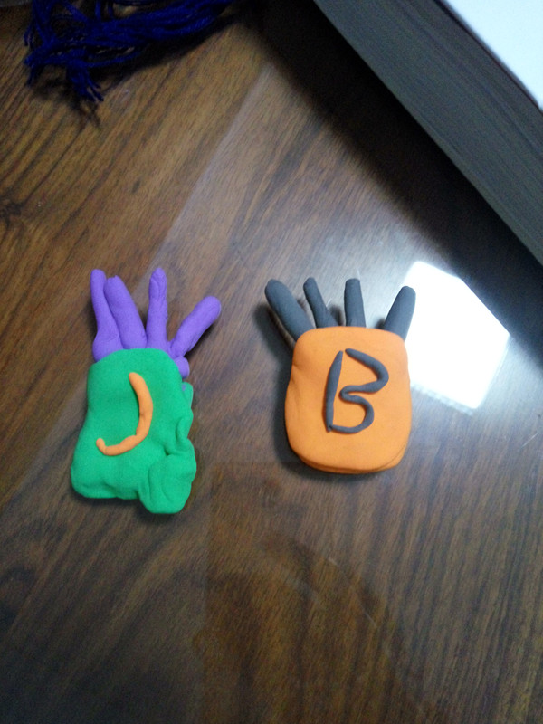 可是这么厚,先看哪个呢?想来想去还是决定随机,眼睛闭起来翻到哪个就看哪个。小皮球也同意我这个主意,就闭起眼睛随便翻了一页,哈哈,翻到了做手工的。刚好家里有超轻粘土,还做个汉堡包、薯条吧。搓条,压扁,合成,看似简单的动作可是很能锻炼小朋友的手指灵活性和手脑的协调能力哦。好在幼儿园也玩过不少,做起来倒也驾轻就熟。不过小皮球也要求我跟着一起做,还说要当我的老师。好吧,那咱们就在有限的条件下,看看谁的薯条做的好吃。为什么要说条件有限呢?因为超轻粘土这个东西有一点特别不好,稍微不注意就会干掉,这不,我们那一桶粘土拿出来也就几个颜色可以用的。本来想做个跟视频一模一样的薯条,可是没有相同的颜色可以用,只能凑合着用其它的颜色代替了。反正意思和效果能出来就行。顺便还能看一下孩子的颜色搭配。看看,我们做的还不错吧?