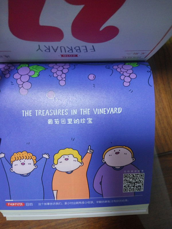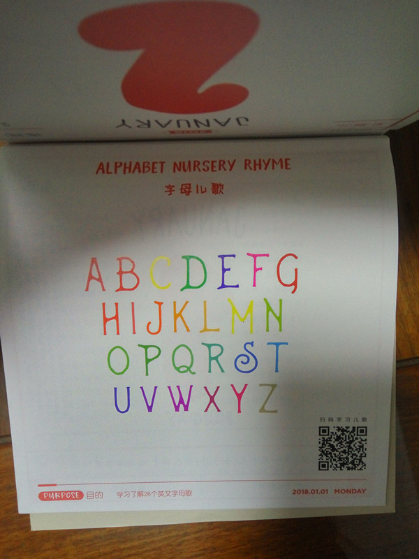日历里还有四十五个象形文字,其中简单一点的不看注释我也能看懂,但是难一点的就不行了。刚好趁着这个机会跟小皮球一起学习了。大班新学期刚开学的时候老师让买过几本写字帖,里面有一本就是汉字的,也教了几个象形文字,小皮球还是挺感兴趣的。学文字涨知识,这个时候就特别佩服老祖宗的智慧,能把复杂的事物用这么形象的字表现出来。除了这些,亲子日历还有英文儿歌哦。同样只要扫一下二维码,就能听到旋律优美的英文原版儿歌,启蒙孩子英语听读能力。另外寓言故事、亲子故事还有不少的色彩实验,相信这些里面总有一项会让你的孩子爱上的。
