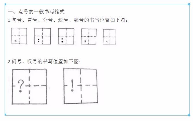 小学阶段需要熟练掌握的标点符号一共有以下十一种,一年级需要了解的是标注阴影的7种标点符号。 ![]() ![]() 书法规范: ![]() ![]() ![]() ![]()
