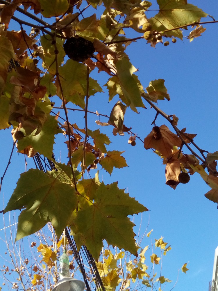 孩子很喜欢梧桐树上的果实,那个圆圆的像球形的,而且还带着一个柄的,之前路过的时候,总是会要求给她来一个的,最近好久都没有走这条路了,孩子听说要给摘球球呢,就开心的往前跑,路过小白兔和大公鸡的时候,也没有太大的兴趣了,直接要求走吧,我们就来到梧桐树下面,抬头看上面的球球,上面果然有好多的球球呢,可惜都很高,我是够不到,我就问孩子,怎么办呢,孩子开始给我想办法,最后告诉我要一个长长的棍子,或者是梯子,可是哪里有这么长的棍子呢,我们左右看了还是没有,孩子在水果店的门口看见一个梯子,赶紧告诉我,我说那个梯子还是不够长的。