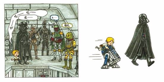 3. 特点鲜明的画风。杰弗里的作品都带有他的鲜明特点,这套书更是结合了星战特色和杰弗里的风格。又因为杰弗里是不折不扣的星战粉丝,才能如此细致地描绘出每一处场景的细节,才能以如此幽默的画面表达浓浓的星战情节和亲子情感。