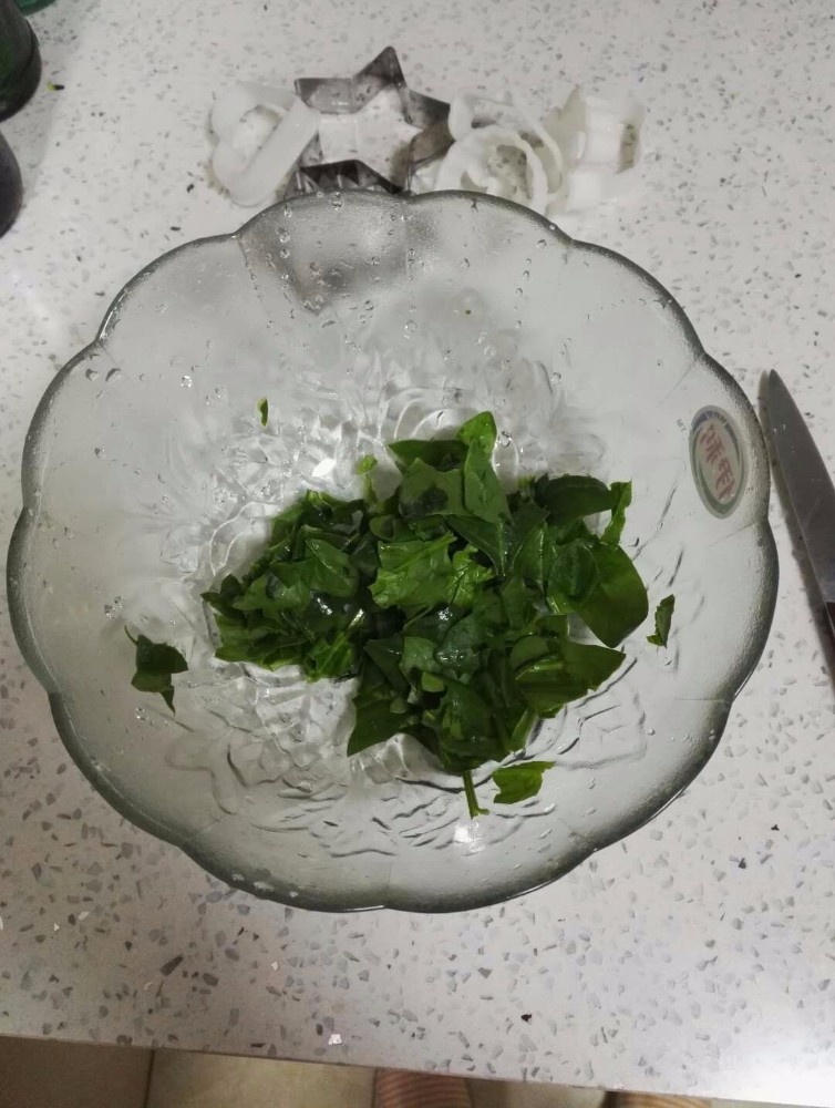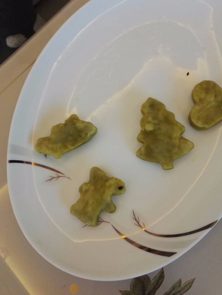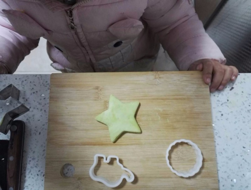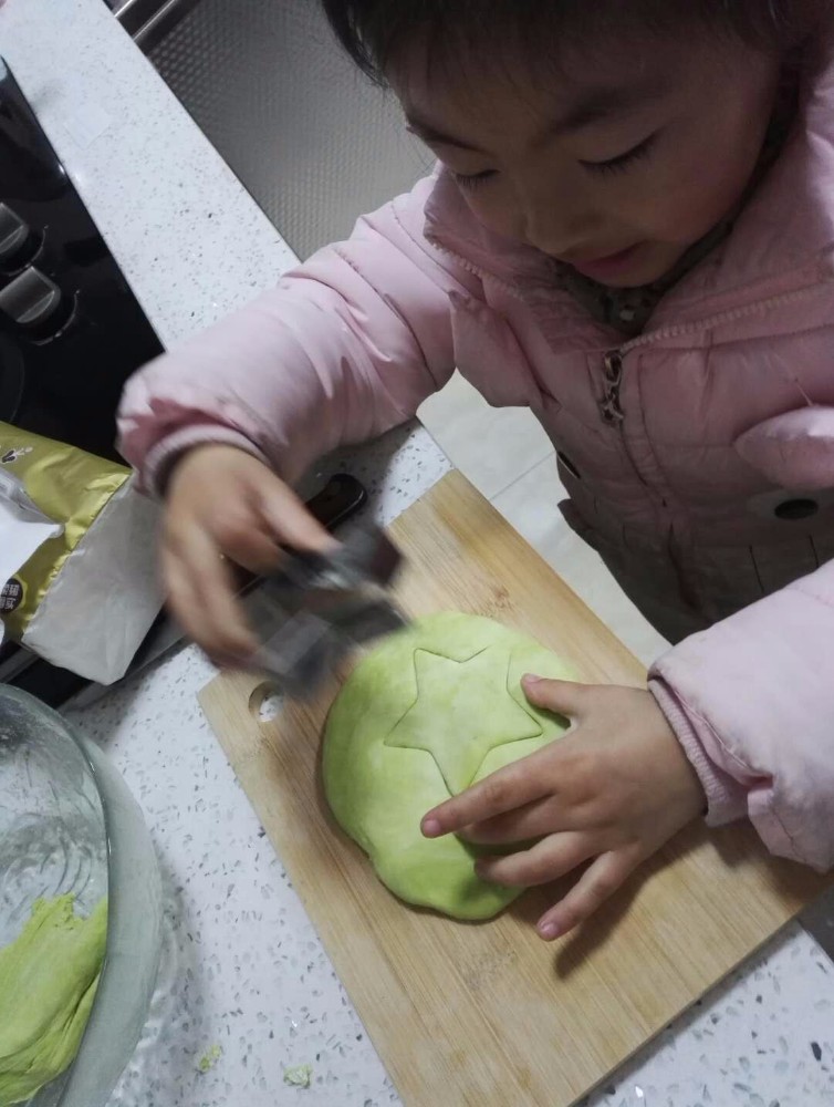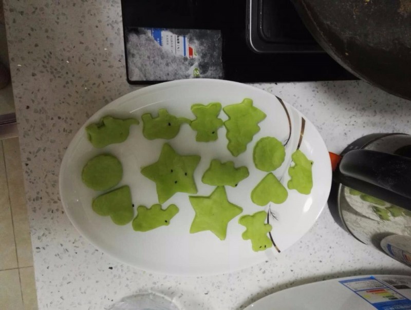其实步骤很简单,就是多加了一步蔬菜汁。我把菠菜切碎,放到榨汁机里,加点水,榨好汁后最好过滤一下,因为小渣子还是挺多的,会影响口感。蔬菜汁里加入酵母溶解,然后倒入面粉里揉成团,发酵,冬天时间要长点,发酵到两倍大就差不多了,然后揉捏几下,用擀面杖压平,用磨具压出可爱的小图形,丫头还是很积极的,要求自己压了看看,还不错哦。最后用黑芝麻做小动物的眼睛。不过蒸好的颜色没有一开始的好看。