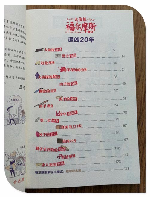 以《追凶20年》这本为例,介绍一下精彩好看的《大侦探福尔摩斯》。形式生动有趣,是这本书给人的第一印象。先来看目录的设计吧,各种小插图的辅助,一来突出了章节重点,二来看起来能够加深印象,不是简简单单的标题而已。再来看书的内页吧,这书的文字都是比较大的,看起来一点都不费眼睛,另外一些突出的词语比如好的形容词、动词、成语等都用特别的形式来标注,有的是颜色的不同加以区分,有的是用特别的形状来突出,对于孩子来讲也是一种词语的学习和积累。还有故事中会安排一些小游戏,让孩子也感受一下探案的神奇,对于孩子来讲也是很好的锻炼。在书的最后面还有“福尔摩斯科学小魔术”给孩子一定动手实践的机会,看故事,学科学,这套书带给孩子很多的收获。