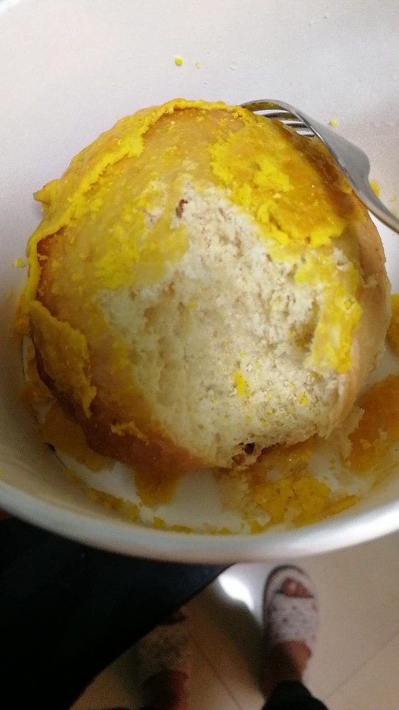 因为在幼儿园吃了饭,所以我去接他们的时候直接去这家饭店打包了两个西瓜汁和两个菠萝包,外加两个蛋挞,吃完好去带他们看电影。当时他俩每人吃了一个蛋挞,喝的西瓜汁,至于这个菠萝包是看完电影以后回家才想起要吃的。反正已经七点多了想想他们也饿了,就让他们俩吃了。没想到他们吃了半天,才啃了不到一半,我当时都没注意,这俩孩子也没告诉我面包有多硬,正好我过去的时候无意看到了这个面包,简直是硬的能把人的头打晕啊。别说咬了,就是用手摸都压不到下面,明明是放置了好多天的成品。 看到这我就气不打一处来,虽然是5块钱一个的东西,两个才10元钱,但我也算老客户了,哪能这么做生意呢,放这么多天的东西不管是新客户还是老客户都不能销售的吧,还好离我家也不远,我非要睹这口气就开车去找他们算帐了。 我直接了当的告诉他们这菠萝包时期太久了,这样的东西怎么能吃下去呢,摸都摸不动更别说是给孩子吃了,还好他们态度不错,直接说要现场给我重新做两个。或许也这是最好的结果了吧,我告诉他们钱是小事,做生意不能这么糊弄人吧。虽然来回路费加上时间老公说根本不值,但我却认识不蒸馒头蒸口气哈,不能就这么白白的吃了哑巴亏。
