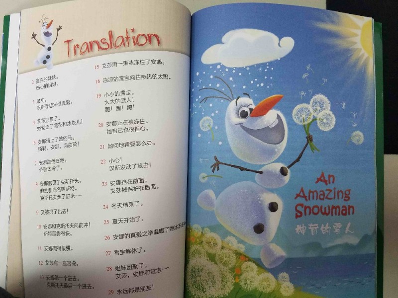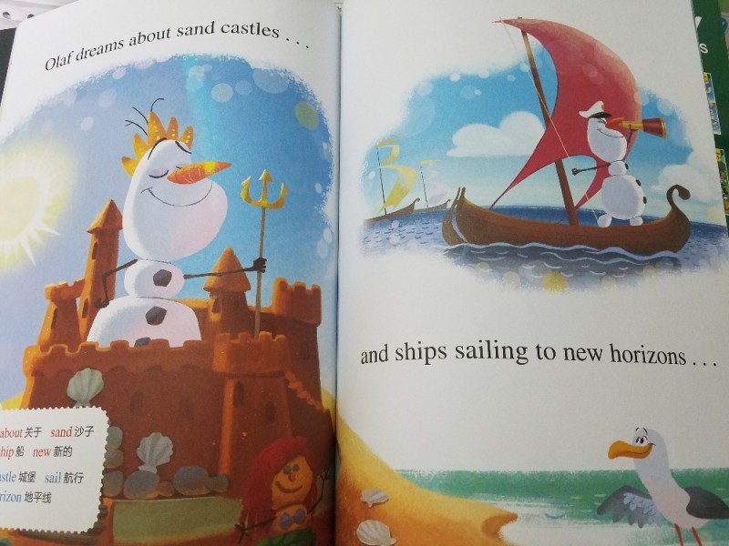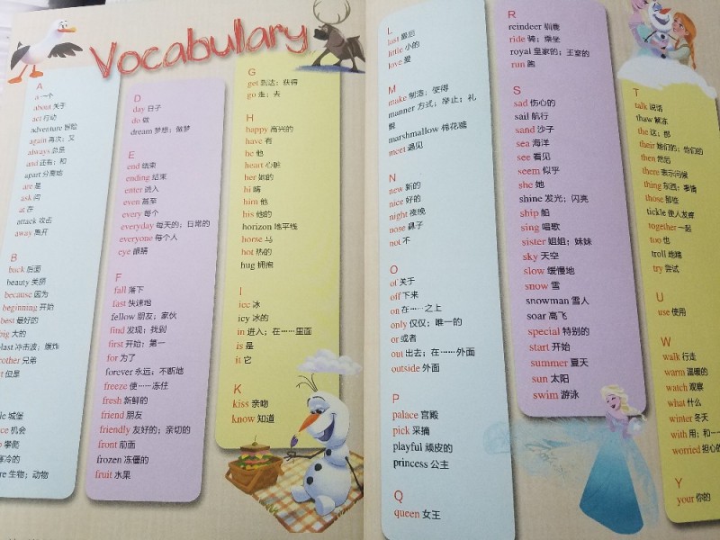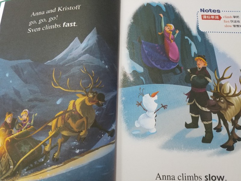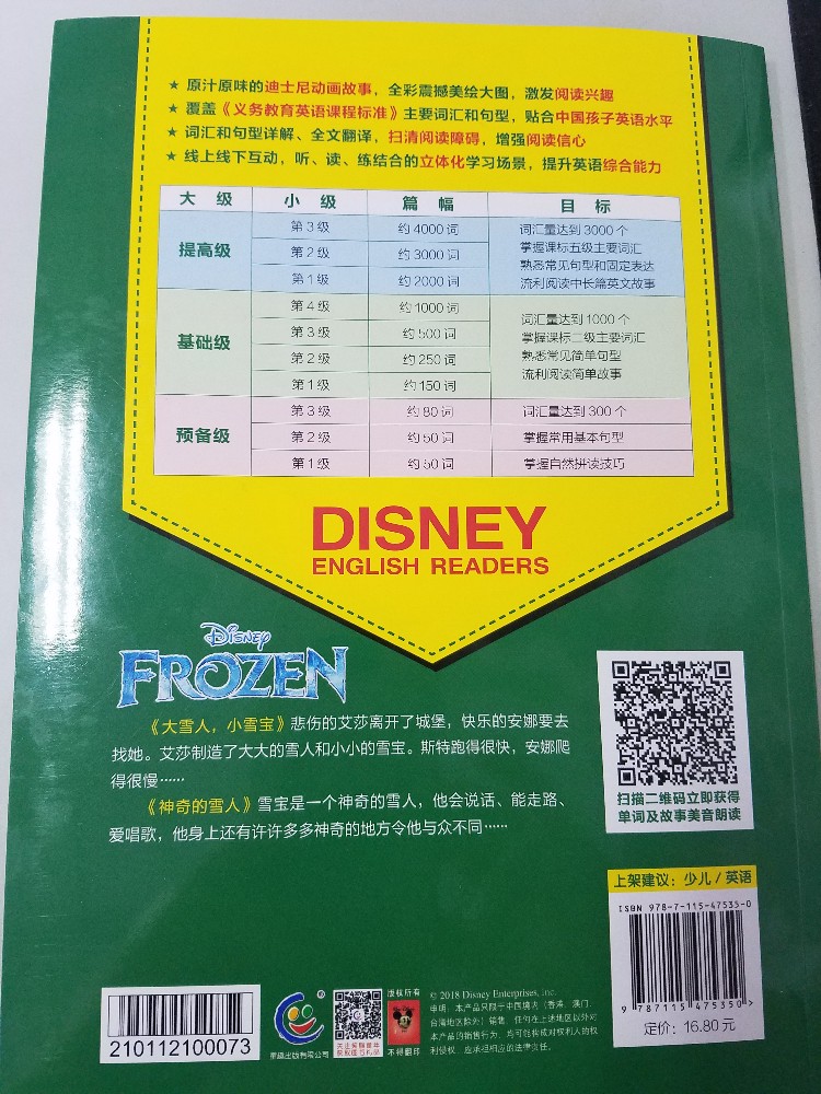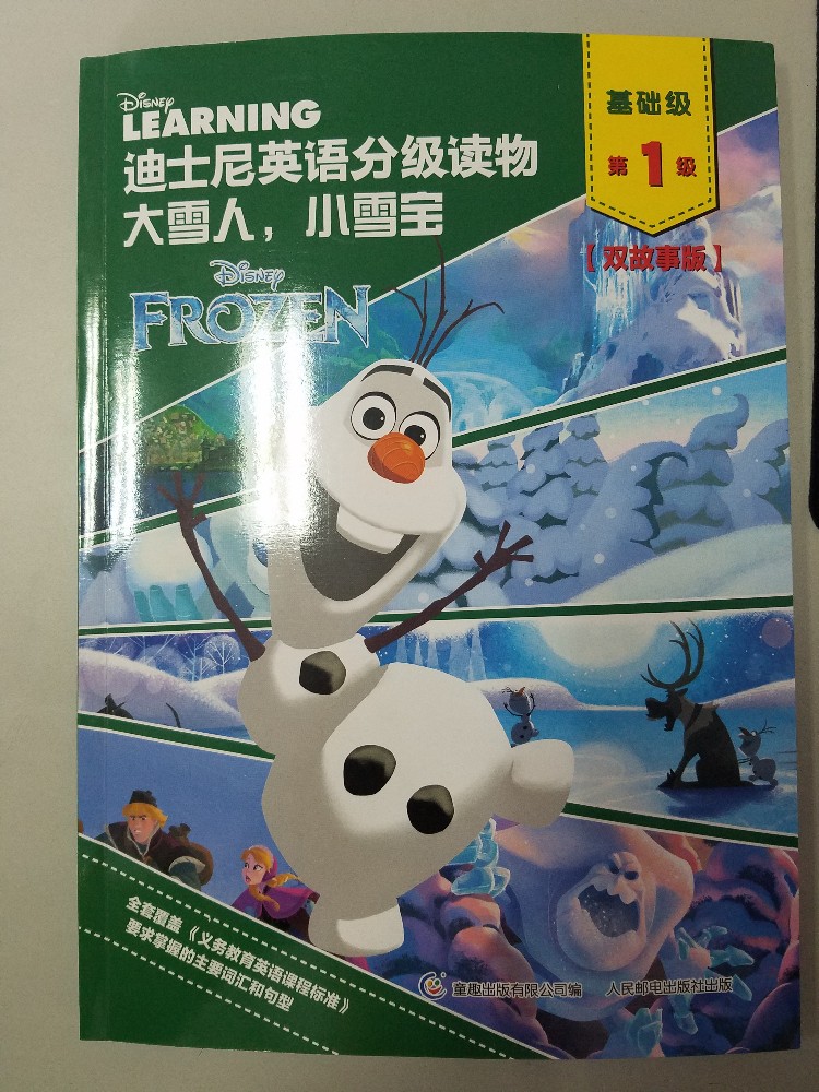 我想地带的妈妈和宝贝们对童趣的书是非常的熟悉非常的喜欢了。我们家也有很多童趣的书了。现在对童趣的分级阅读也是格外的喜爱。能够争取到试读真是非常非常的幸运。每一次童趣的编辑来分享,不单介绍书籍的内容和特点,还会跟我们大家分享很多的育儿知识。我觉得特别的实用。 这次分享的是《迪士尼英语分级读物基础级第1级》,之前编辑老师还分享过《迪士尼英语分级读物提高级第1级寻梦环游记》。这两个级别真的是区别很大。提高级一级里面大概有2000个词汇。基础级一级大概是150个词汇。我觉得女儿现在上三年级,学习了大概两年英语,我觉得里面不会的单词还是非常多的。我发现现在我们孩子学英语基本都是以读为主。老师基本没要求过背单词。跟我们原来学习英语的方法不太一样了。下面我先简单的介绍一下这套书。 《迪士尼英语分级读物》一共分为三个大级,分别是预备级、基础级和提高级。每一个级别里面又分为几个小级。从让孩子掌握自然拼读的技巧在到词汇量达到3000个。循序渐进。让孩子通过故事阅读就可以不知不觉的学习英语。基础级特意挑选了6-9岁孩子喜欢和熟悉的动画故事,比如“冰雪奇缘”“小熊维尼”“赛车总动员”“海底总动员”“迪士尼公主”“米奇妙妙屋”等。我们收到的是《小雪人,小雪宝》,这本书里有两个故事,还有一个故事是《神奇的雪人》。书中大概有四部分,首先是讲述故事、故事中文翻译、词汇表、根据故事内容进行的小游戏。先学习在通过游戏的方式巩固。非常好的学习形式。每一页的句子很简短。英文跟中文翻译是完全分开的。还有课标单词和单词的常用结构和拓展词汇。在书的后面还有一个二维码,扫描后可以听到单词和故事的美音朗读。家长也不用担心自己的发音不准的问题了。老师还跟我们分享了如何使用这本书。第一天的时候要亲子共读第一个故事,结合每页Notes中标注出课标单词、拓展单词,以及常用结构。第二天的时候让孩子自己听一听纯正的语音。自己纠正发音。第三天的时候一起阅读第二个故事。第四天的时候还是让孩子听语音。第五天的时候跟孩子一起复习重点单词。第六天还可以一起看看相关的动画片。我觉得老师这个安排非常的合理。 通过这套书孩子一定会对学习英语有一个浓厚的兴趣。