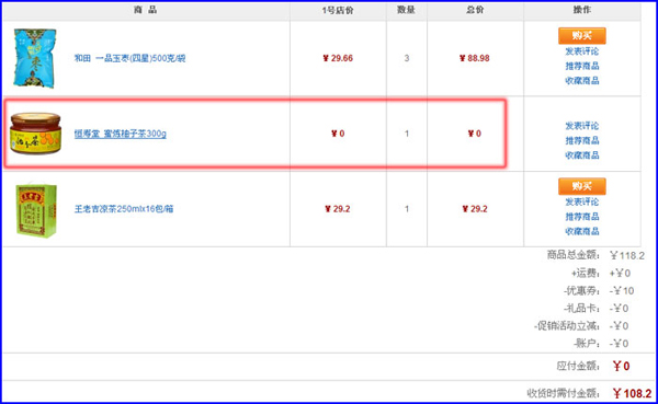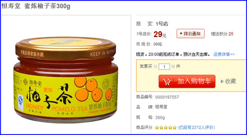 半个月前,家里的王老吉终于又要喝完了,老公让我上网再买一两箱。打开一号店,先去看了下0元抢购的商品,柚子茶已经被抢光了……唉,真可惜!跟老公商量过后,我俩一致决定明天再来抢,无论如何也要把它抢到手不可!第二天一下班,我就赶紧打开一号店看看,结果,又显示柚子茶已抢光……气的我决定熬夜盯着它!我就不信,0点的时候我来抢,还会有谁比我早? 于是等啊盼啊,好不容易到了0点,我刷新刷新再刷新,一直等到了快1点,柚子茶那里总是显示已抢光的状态……哎?怎么回事?难道这商品不是0点自动上架啊?失败!为了这瓶免费的柚子茶,我转过天来早上刚一到公司,第一件事就是打开电脑、进入一号店,去抢这瓶柚子茶。结果,早上8:40还是显示已抢光……当时我心里就想:这不会是骗人的吧?总挂着这产品在上面吸引大家来,可他们却不真的把商品上架,让大家误以为总是自己抢不到…… 这时候,我心里已经不再只想占这一瓶柚子茶的便宜了,而是想确认一下,这一号店到底是真的在吐血促销,还是在欺骗消费者……于是,第二天早上我特意定了个6点的闹钟,起床后第一件事就是去一号店看柚子茶的状态。这次惊喜的发现,0元抢的柚子茶居然有货!!!我太激动了!!赶紧登录账号进去购买!再加上我支付宝账号在一号店的优惠特权,全场只要满100元,就能立减10元。最后花了108.2元,买到了118.2元的商品,而且还包邮哦!最重要的是,还以0元的价格买到了这瓶恒寿堂蜜炼柚子茶(300g)……尽管只有300克,可毕竟它是免费的呀!哈哈~