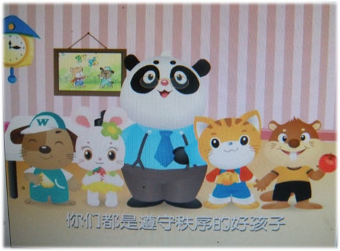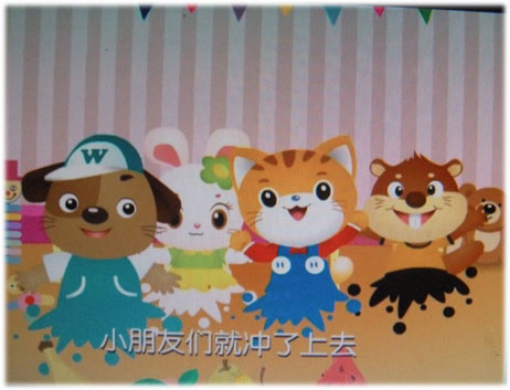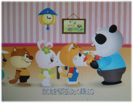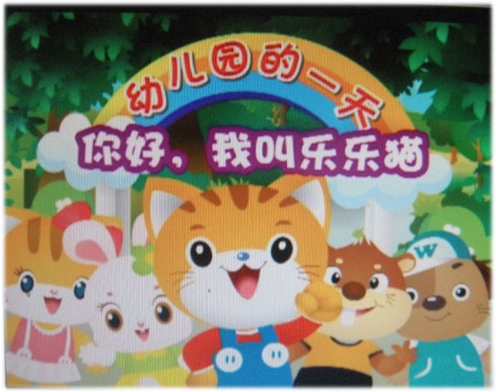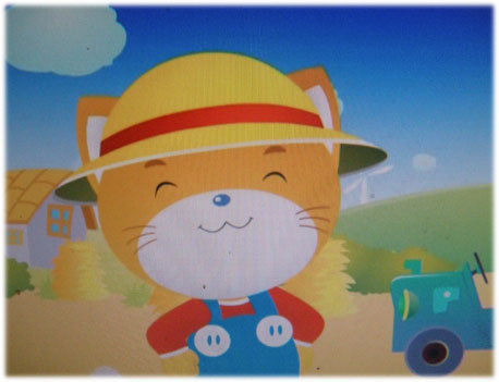 开头先是不到一分钟的广告宣传,与其它早教光盘似乎有些像,宣传结束后,看到屏幕中有个“全部播放”。点击后出现了主人公乐乐猫的自我介绍,我对这些人物介绍没太大好感,秃秃却在一边看得出神……看了两三遍,他已能很准确的叫出几位主人公的名字了:乐乐猫,小白兔美美,皮皮,小狗木木(秃秃总发不了木木的音,可能他嘴唇的反应度还不那么灵敏吧,他自己也能感觉出发音有点不太对劲,自己小声重复的念了好多遍,边练习边纠正呢)~~