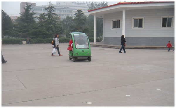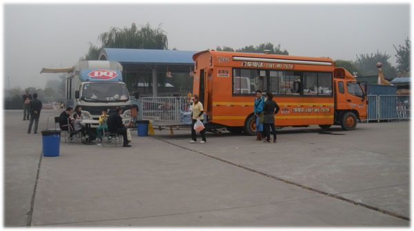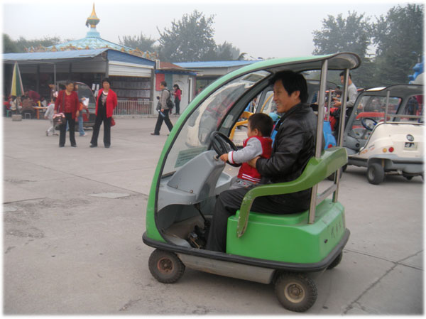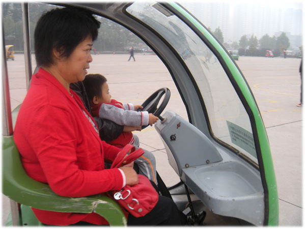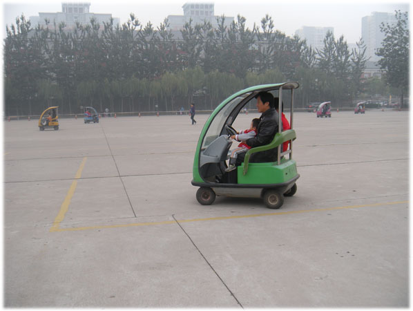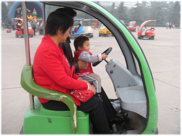 爷爷带他开完一大圈回来之后,秃秃显然还没有玩尽兴,总想扒开爷爷的手,自己去握住方向盘~~奶奶见他们玩的开心,也跟着一起上了车,小家伙又和爷爷携手共同开了一会儿车之后,他才舍得把方向盘全全让给爷爷,自己让奶奶抱着在一旁沿途观赏风景……他们又开到了很远很远的地方,虽然车速不快,可我徒步还是不容易追上,于是我留在原地随便的走走看看,等他们回来…… 公园里有吉野家和DQ的餐车,为了方便玩不够的孩子们不会饿到肚子,不过我们没给秃秃买快餐,总感觉这种东西吃了不如家里的饭营养。看着广场中来来往往的电瓶车,看着一个个家长带着自己的孩子开车闲逛,真替他们感到幸福~~平时大家上班都忙的喘不上气来,偶尔放个假,总想在家倒头大睡,若不是为了陪孩子,几个人能有这样的闲情雅致来公园散心放松呢?!陪孩子出来玩虽然很累,可是在小宝贝的带动下,我们真能发自内心的笑出来,这样一个看似无聊的玩具电瓶车,也能让我们这些大人玩得如此上瘾、笑得如此开怀,感觉真好……