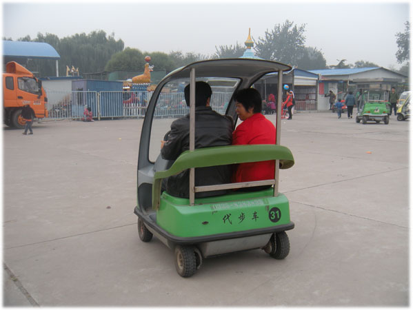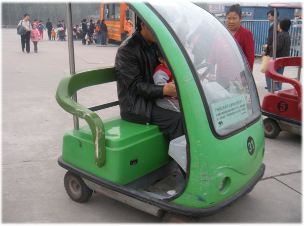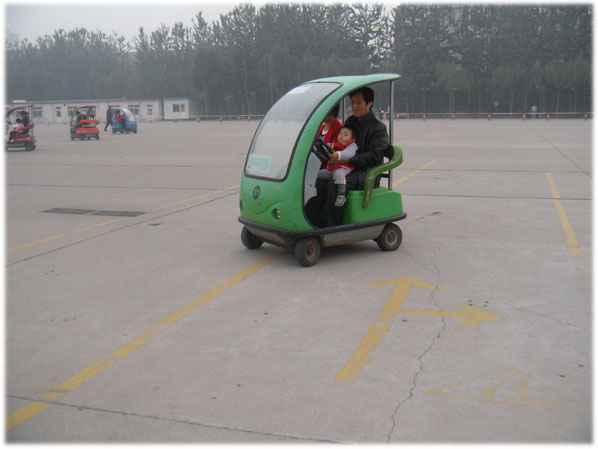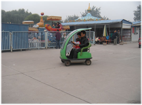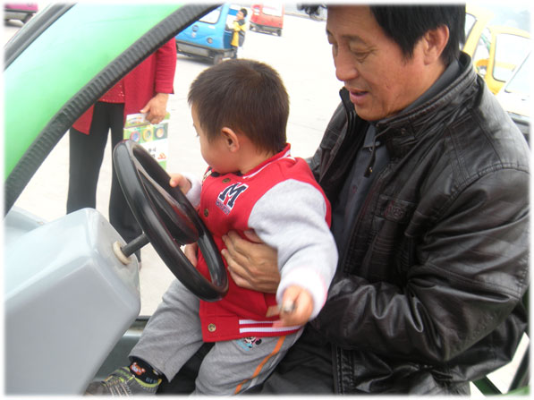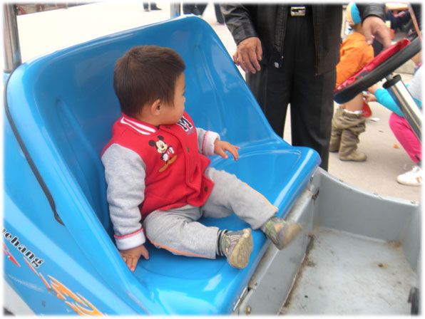我们在公园里看到一种电瓶车,大人和孩子都能开的。秃秃从小就喜欢汽车,看到这种新型玩具,自然会走不动跑啦~~不管三七二十一,他就爬上了辆车,一边晃动方向盘、一边大喊滴滴哞哞~~看他这么喜欢玩,奶奶忍不住花钱给他买了票,想让孙子感受下车子真正行进时的快乐……据说新车还有倒档呢,功能真强大,不过秃秃还小,不会玩那么高深的东西,所以我们不需要玩新车,只开个旧车过过瘾得了~~