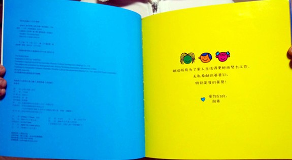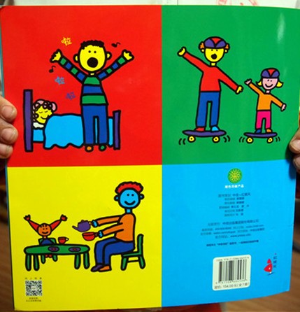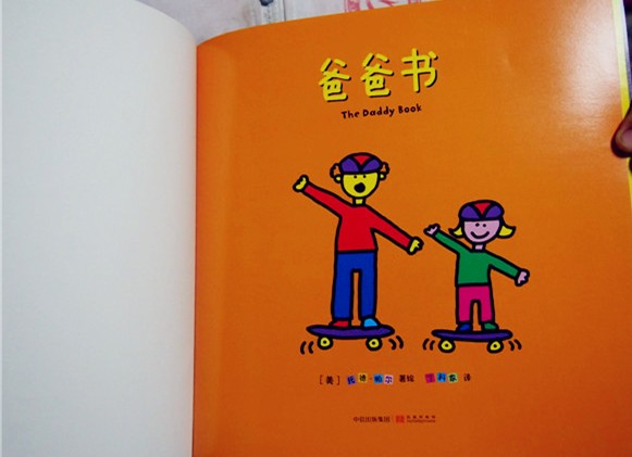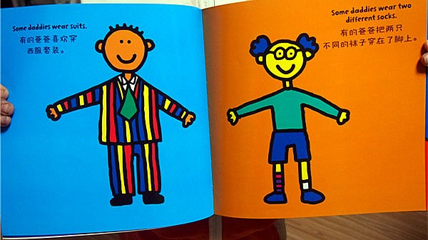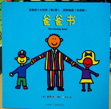 我们收到的是这套书中的《爸爸书》 这本书还荣获了2003年奥朋汉玩具系列奖 封面看起来就很喜感:爸爸左手右手各领着一个小孩,分别是他的儿子和女儿 绘画风格也非常卡通化,看起来就像是刚学会涂鸦的小孩子画的 色彩运用方面也是非常的大胆,色彩饱和度高、非常明快 人物表情看起来很单一,统统是嘴巴朝上微笑的表情 这样的绘本会让孩子很有亲切感