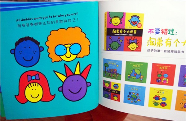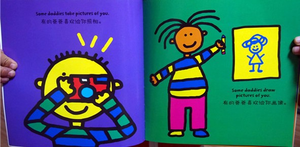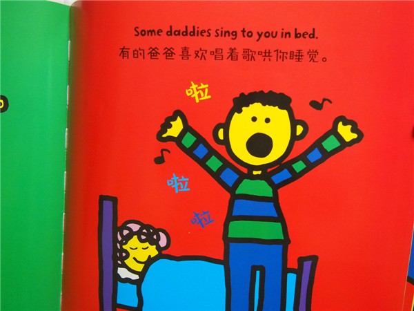 当初申请试读书时,看到“家的味道”这几个字,就被深深吸引住了。相信有些文字是带着温度的,“家的味道”就是如此,看到它们,就无端的生出许多感慨来——家,永远是我们心中最柔软的角落。编者大概也是有着这样温暖的关于“家”的情愫,所以向孩子们展现出各种各样“家的味道”,帮助孩子对对“家”的理解,让孩子学会理解爱、分享爱。 这套书是《纽约时报》畅销书系列,也是美国幼教行业热门情商培养书,更是世界知名音乐人艾尔顿•约翰及国内外众多阅读推广人联袂推荐的书籍。作者托德•帕尔是美国的畅销童书作家,他已经为孩子们创作了四十多部作品,深受家长和孩子们的欢迎。 这是一套双语版的系列书籍,目前桐桐已经上四年级了,英语也已经学习了两年,让他经常接触一下这样的双语书籍,对于他的阅读习惯有很好的帮助。 这套书主要是展现家庭成员的一些生活习惯、不同的做法等等等,通过这些家庭成员,来更多的表现出对孩子的爱,这样的家才是温暖的所在,因为我们每个人的爸爸妈妈、爷爷奶奶、外公外婆,虽然有着不同的行为习惯,但他们就是我们动力的源泉,不断给我们成长的滋养和力量。 这套书更是有着强烈的艺术感染力:从这套书的绘画用笔风格就可以看得出,作者有一颗童心未泯的心,他善于运用各种鲜明、超高饱和度的色彩来呈现他的绘本世界,例如纯红、明黄、天蓝、草绿、玫粉、泥巴黄、橘红、雪白等等,这些画面冲击感很强,也是孩子眼中丰富的色彩世界,让孩子们每翻阅一页都会充满强烈的喜悦感和存在感。作者更是在书中大胆运用了典型的纽约哈林式涂鸦风格,使卡通形象生动而活泼,充满欢乐和童趣,极易与孩子的世界产生共鸣。 我们最关心的英语方面:孩子能不能读得懂呢?孩子对英语感不感兴趣呢?不用担心,因为 原书的英文中呈现出相似句式的排列和有节奏的韵律感,例如:“Some daddies…Somedaddies…”类似的重复性的英语短语,并且用英汉对照的形式呈现出来,不妨碍英文不好的家长们与孩子一起享受绘本的阅读时光。这样的双语版绘本也能够帮助孩子尽早开始英文启蒙。