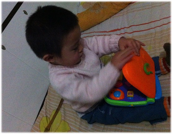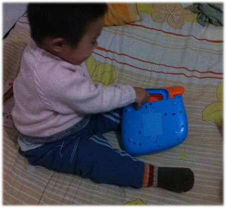 今年秃秃过生日的时候,大爷爷还给他送来生日礼物,一个小型的便携式学习机。刚一拿出来,他就控制不住的抢过去玩,面对第一次相机的学习机,秃秃一点都不外行,掀开盖子就开始噼里啪啦一通乱按(在送来之前就已经帮他装好了电池)。