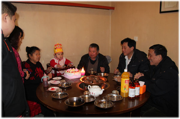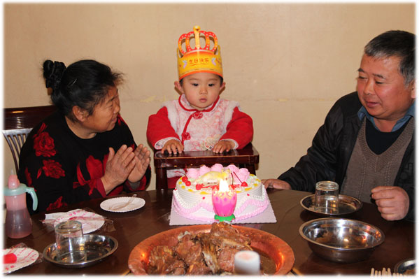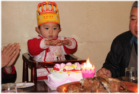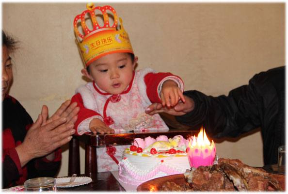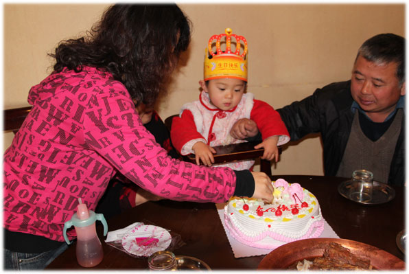 11月25号,是秃秃的阴历生日,简单过;11月26号,是周六,全家聚餐切蛋糕,为他隆重过;12月16号,是秃秃的阳历生日,简单过,12月17号,是周六,全家以及大爷爷家聚餐切蛋糕,为他隆重过…… ![]() 吃饭时,伴他左右的是姥姥和姥爷,我们其他人依次向外排开。这是姥爷给他买的生日蛋糕,虽然不贵,但也能略表心意,上面点缀的小樱桃也相当烘托气氛呢~~原本正四处观望的小秃秃,一看蛋糕上桌,立刻收回了目光,集中盯在了这美味蛋糕的身上。我们还没各就各位,他已经寻思着准备开抢了!姥姥告诉他,要等妈妈把叉子和刀拿出来,才能切蛋糕,于是他就不错眼儿的看着我,催我动作快点,赶紧取出刀叉分切蛋糕给他……