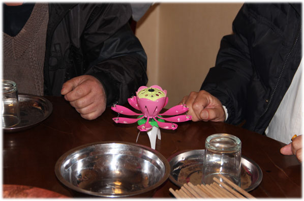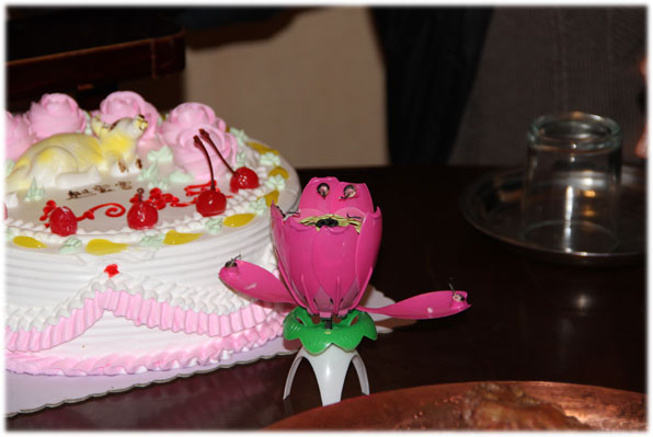 我们指着莲花式的蜡烛,正研究要怎么去点,秃秃已经馋得出了神,两眼直勾勾的盯着蛋糕发呆~~终于盼着要切蛋糕了,姥姥还要求秃秃给我们唱首生日快乐歌!小家伙被姥姥整的没辙没辙的,勉强唱了几句,然后大家就开始盯着蜡烛看,等待莲花的开放……我们傻傻的等了快一分钟,怎么莲花没有一点要开放的迹象呢?后来才突然反应过来,我们点蜡烛时点错了位置,应该先点燃莲花的中心点,花瓣才会慢慢张开……唉,一群外行人士!