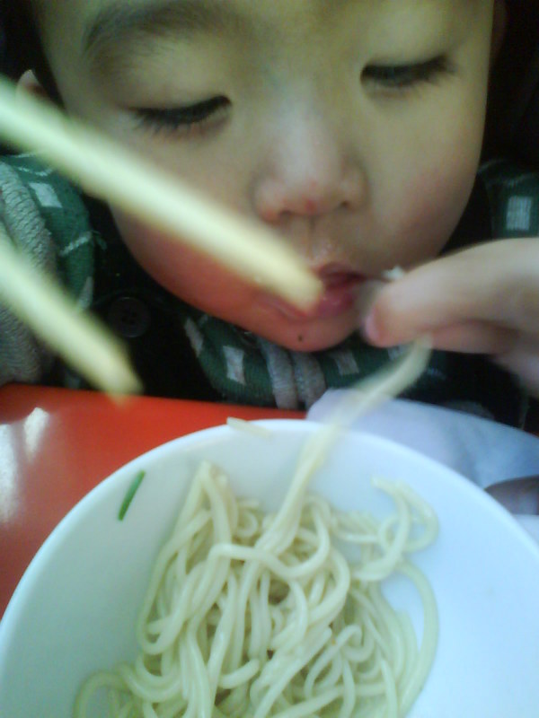当我们那一大碗上来的时候又给他挑了几根 我都不敢让他这么放开了吃 怕他撑坏了 他爹说没关系 面条吃不坏