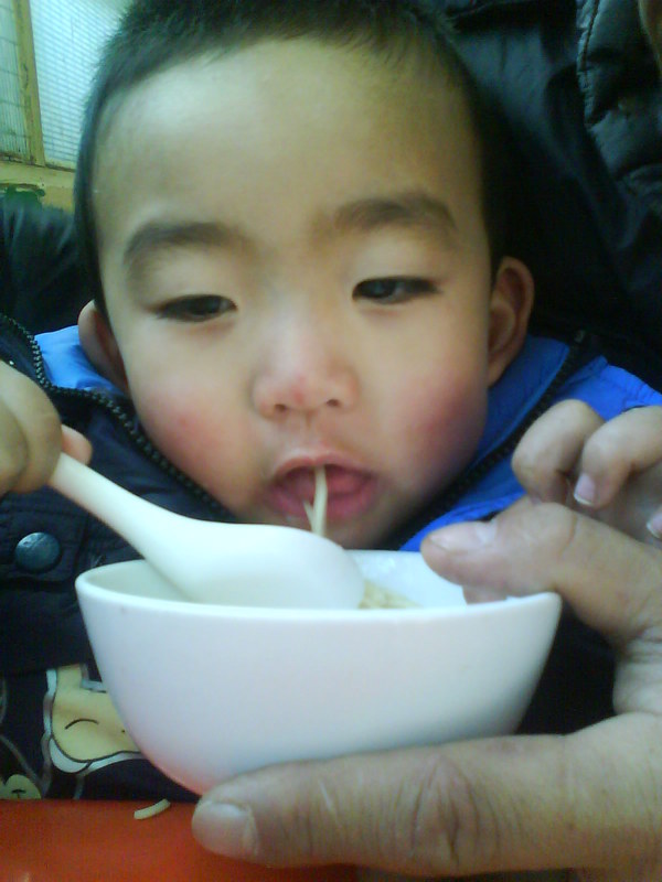 于是让老板又加了一大碗 就这小仔面前的小瓷碗。。。 就这容量 他已经吃完了满满的一碗半了 (脸上吃的都是)