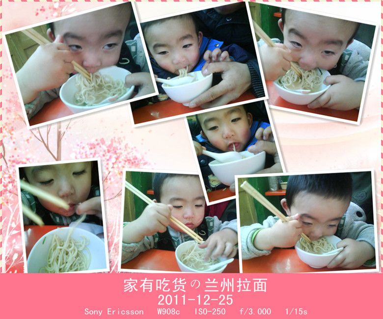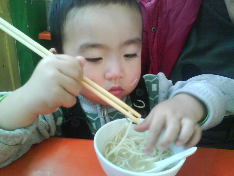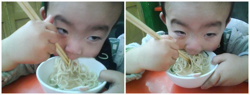 前几个星期 谦谦因为吃的油腻东西太多有点积食 所以胃口一直不是很好 又是周末。。又是面馆。。。 近一周没什么胃口的小家伙来到面馆 这次可是敞开了怀的吃 刚开始我们只要了一小碗 吃到最后我们惊奇的发现这一碗面根本就不够他吃的 我跟他爹这伙食还没找落呢 (瞧这眼神哟。。)