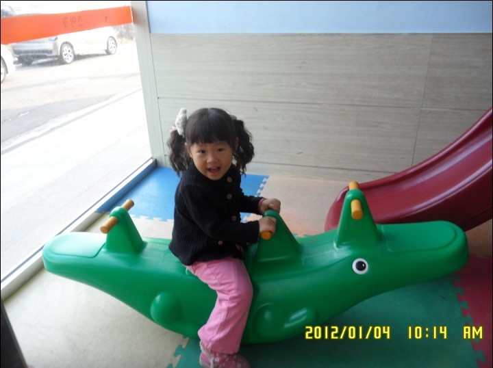 这就是我们经常去的儿科了,里面有滑梯和跷跷板 姐姐自己坐在鳄鱼的跷跷板上玩的很开心,本来是脱鞋才可以进去的,因为有的小朋友不脱鞋 所以里面不是很干净妈妈就没有让姐姐脱鞋