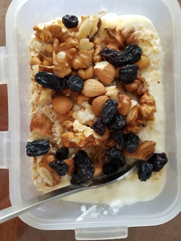 之前在下厨房里看到过燕麦酸奶,其实很简单但是没有尝试过。因为我总觉得这样吃好像不当饭啊。其实这也是我胖的一个原因吧。就是管不住嘴。而且吃少了也不行。总觉得会吃不饱所以早晨带一堆东西。有一次去逛商场,也就是无意中看到了包。后来我老公还调侃我说:“这些包都不符合要求,因为装不了饭盒”。这次在一个帖子里发现这是一个比较适合减肥人的菜谱。我也就决定尝试一下。 做法很简单的,就是在器皿里先放入一层酸奶然后在铺上一层即食的燕麦然后在铺上一层酸奶和一层燕麦。最上面可以放一些坚果。也有放水果的。比如芒果和草莓、西瓜什么的。减肥好像是最好不要吃西瓜。因为西瓜糖分太大不利于减肥。我是买了一大桶中粮的坚果。里面核桃仁、榛子仁、腰果、巴旦木什么的都有。当然是核桃最多了。然后搅拌均匀后吃就行了。因为我的酸奶是自制的,所以有点酸。我又倒了一些蜂蜜和葡萄干进去。这样增加了甜度。蜂蜜能增强抵抗力、解毒杀菌、健脾胃、润肺止咳。好的作用非常多。葡萄干也是补铁的佳品。好了开吃吧。又好吃又可以吃饱。
